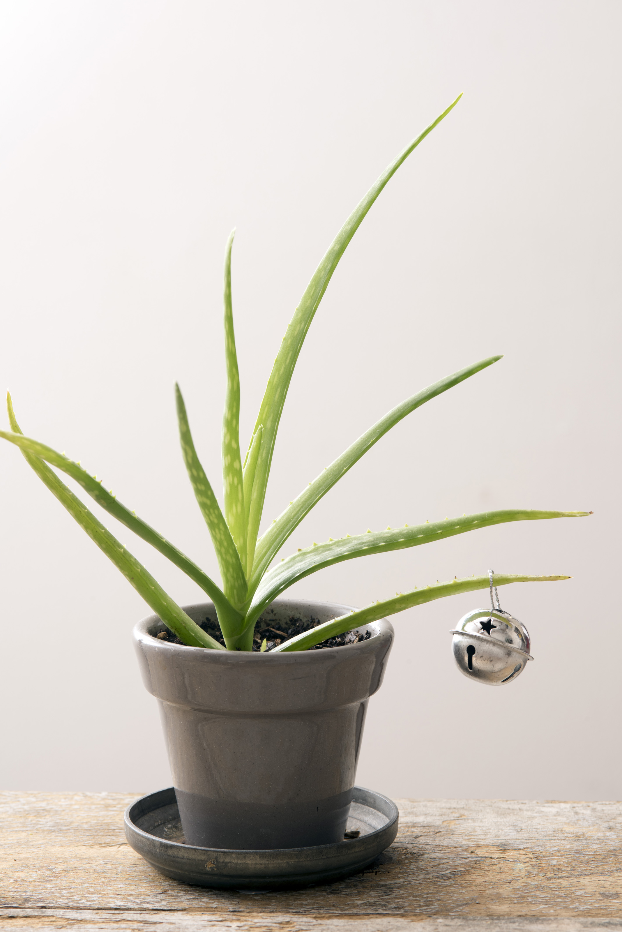 Image Description: a lone silver jingle bell tied to a small aloe plant