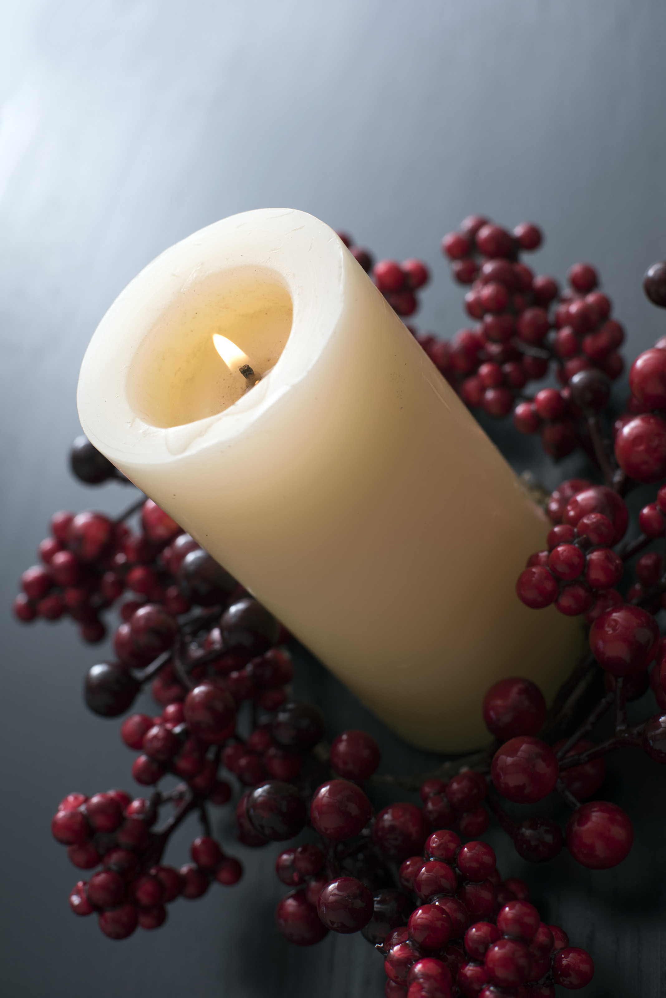 Image Description: a large chruch candle, lit and surrounded by a wreath of red berries