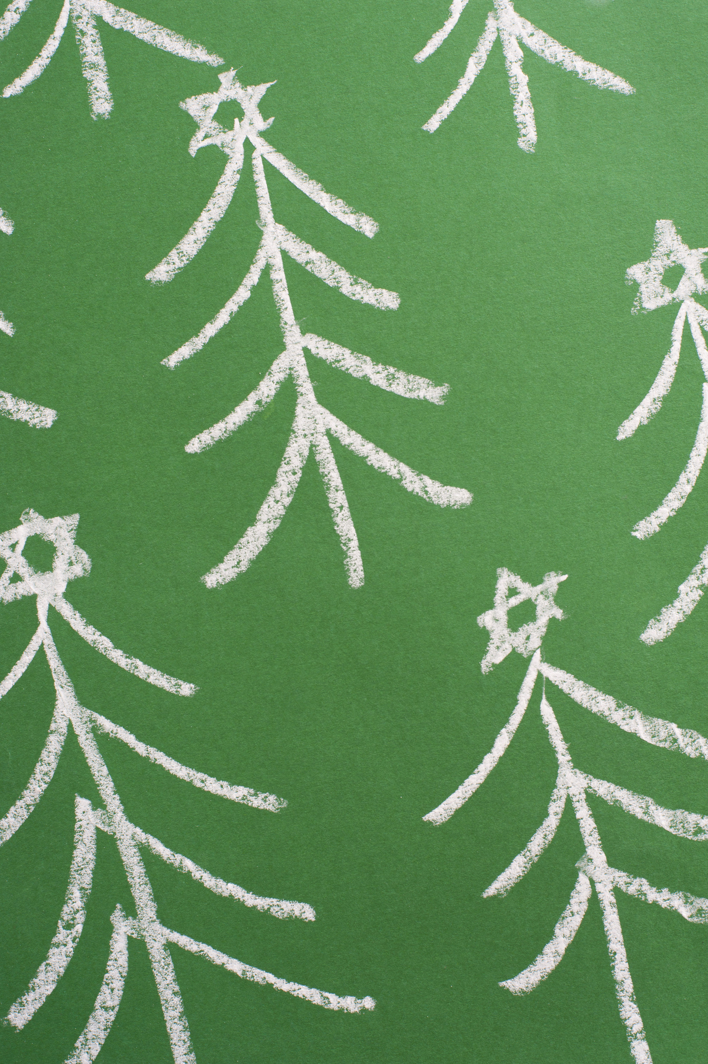 Image Description: Hand-drawn chalk Christmas tree background pattern with simple childlike pine trees decorated with stars on a green chalkboard
