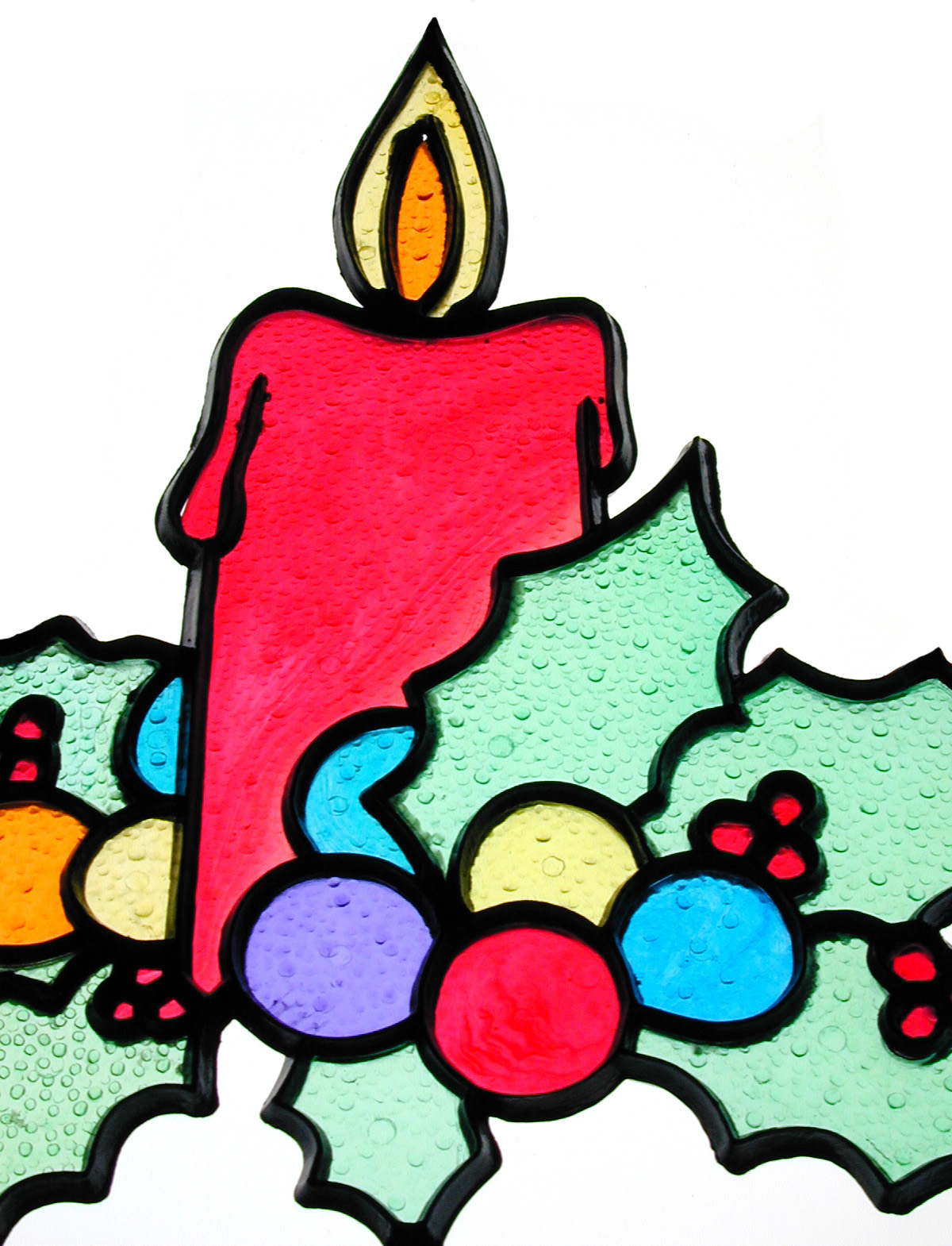 Image Description: Colorful Christmas card or invitation background with a burning candle and holly with multicolored berries over white with copyspace