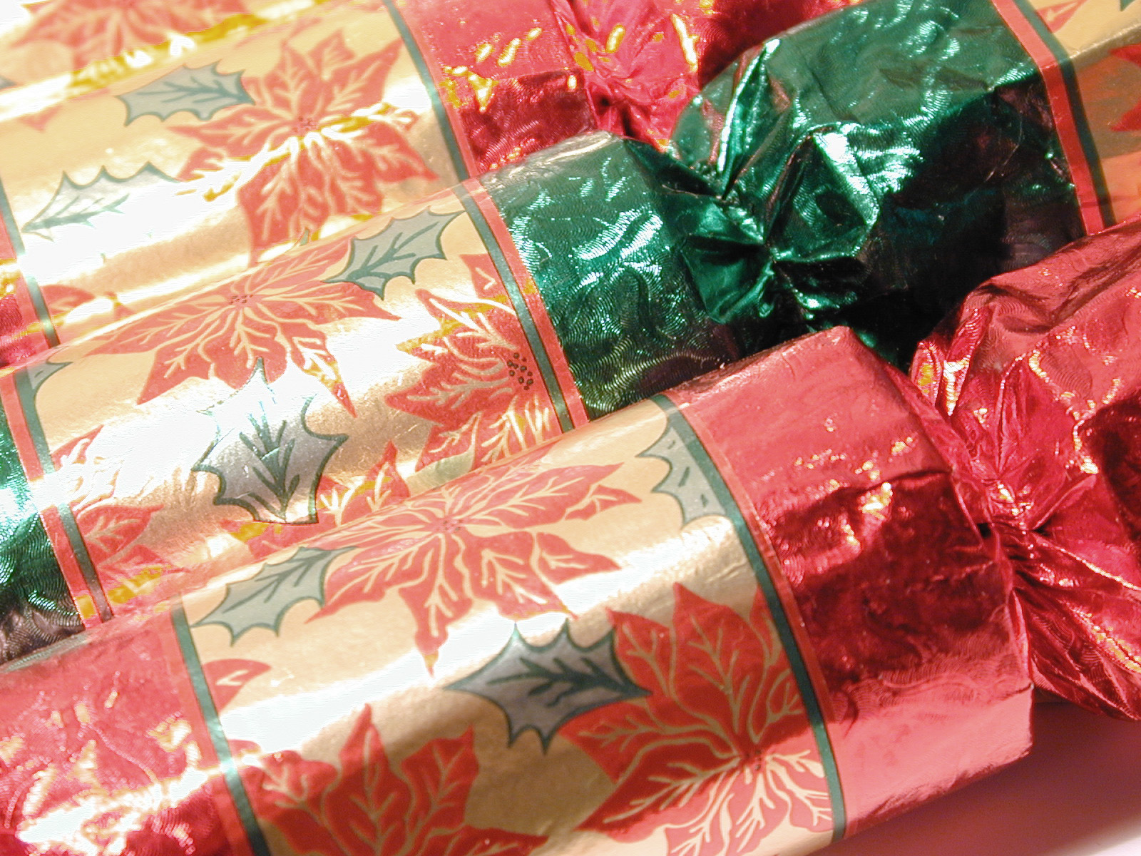 Image Description: Christmas crackers with decorative poinsettias on the shiny gold wrapper viewed close up ready for a festive Xmas table