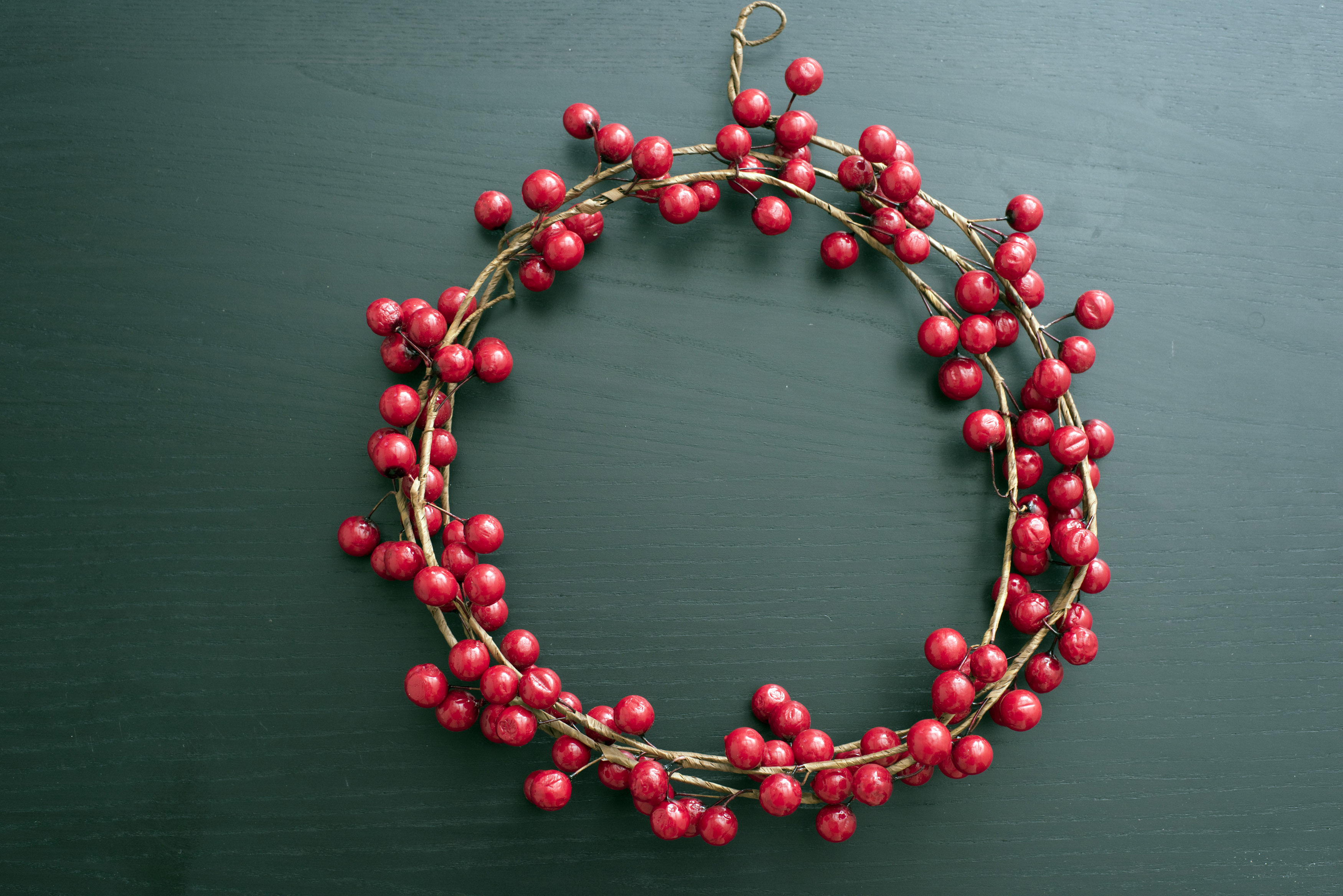 Image Description: Red cranberry circular berry wreath for Christmas over a drak background with copy space for a seasonal greeting