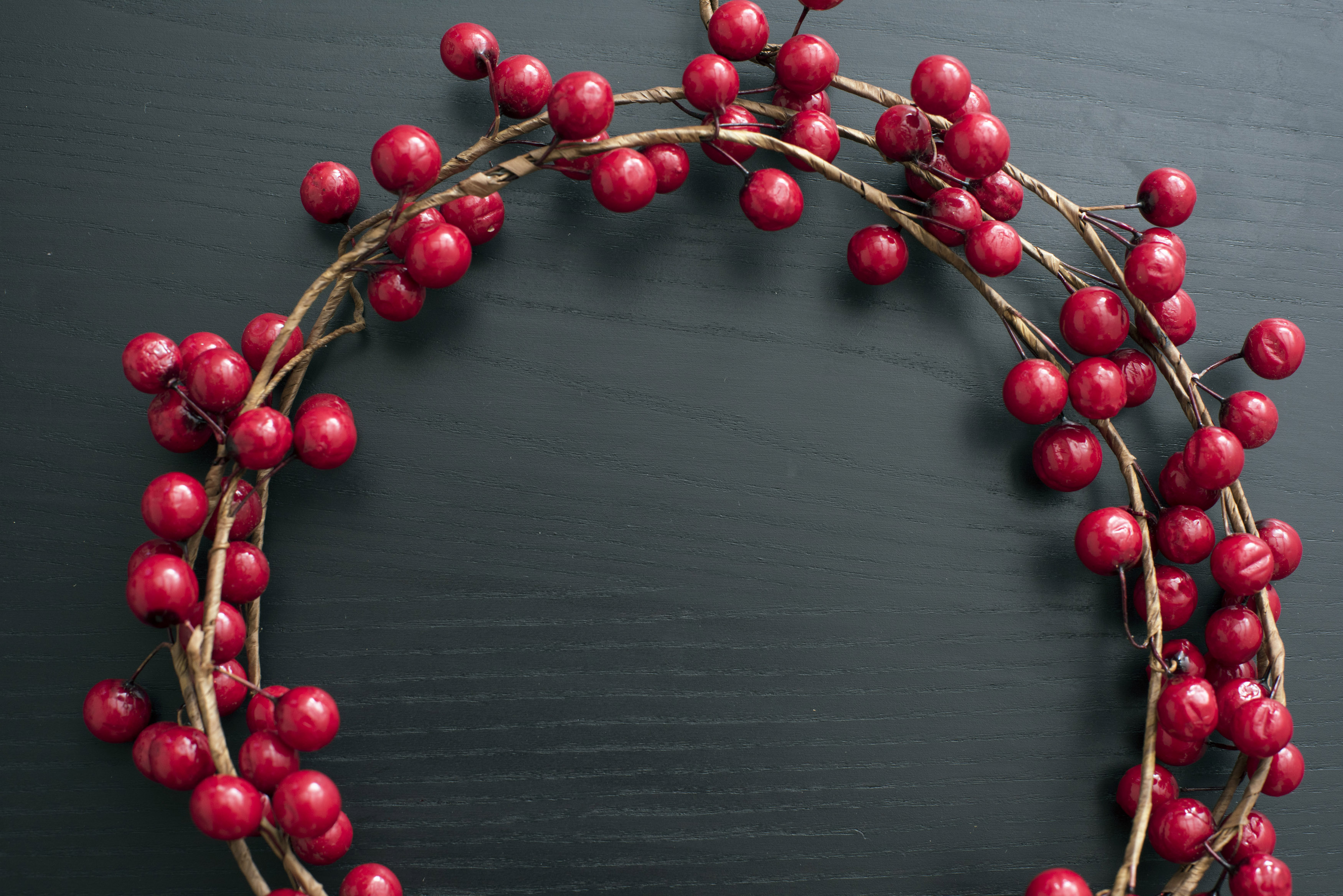 Image Description: Christmas wreath of colourful red cranberries over a dark wood background with central copy space for a seasonal greeting