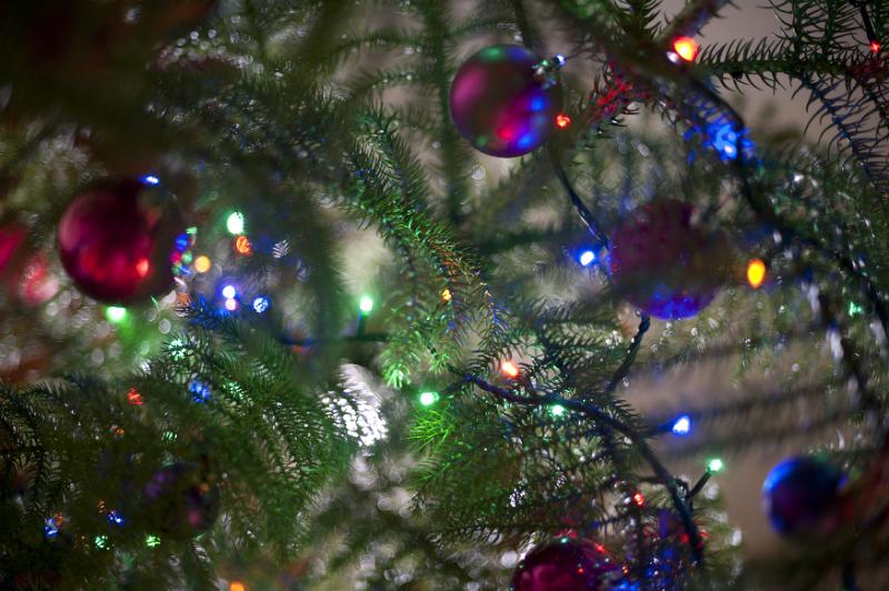 Image Description: Close Up of Young Green Christmas Tree with Branches Decorated with Colorful Festive Baubles and Strings of Lights