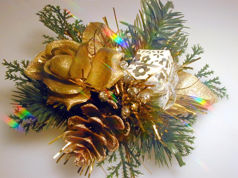 Image Description: Gold themed festive bundle with a rose, pine cone and small Christmas gift in green foliage, close up view