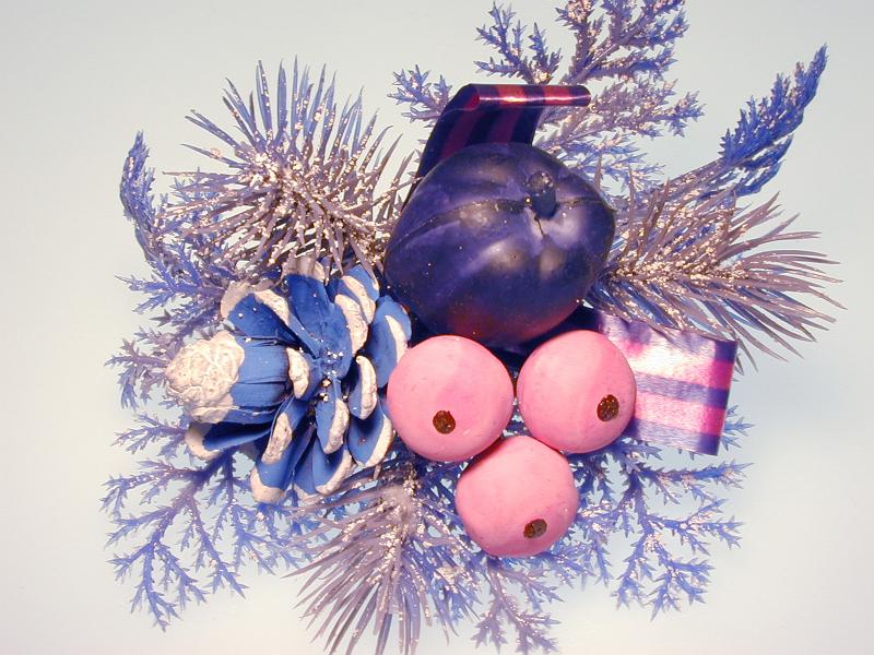 Image Description: A Silver coloured decortative christmas sprig with pink and purple coloured berries and balls