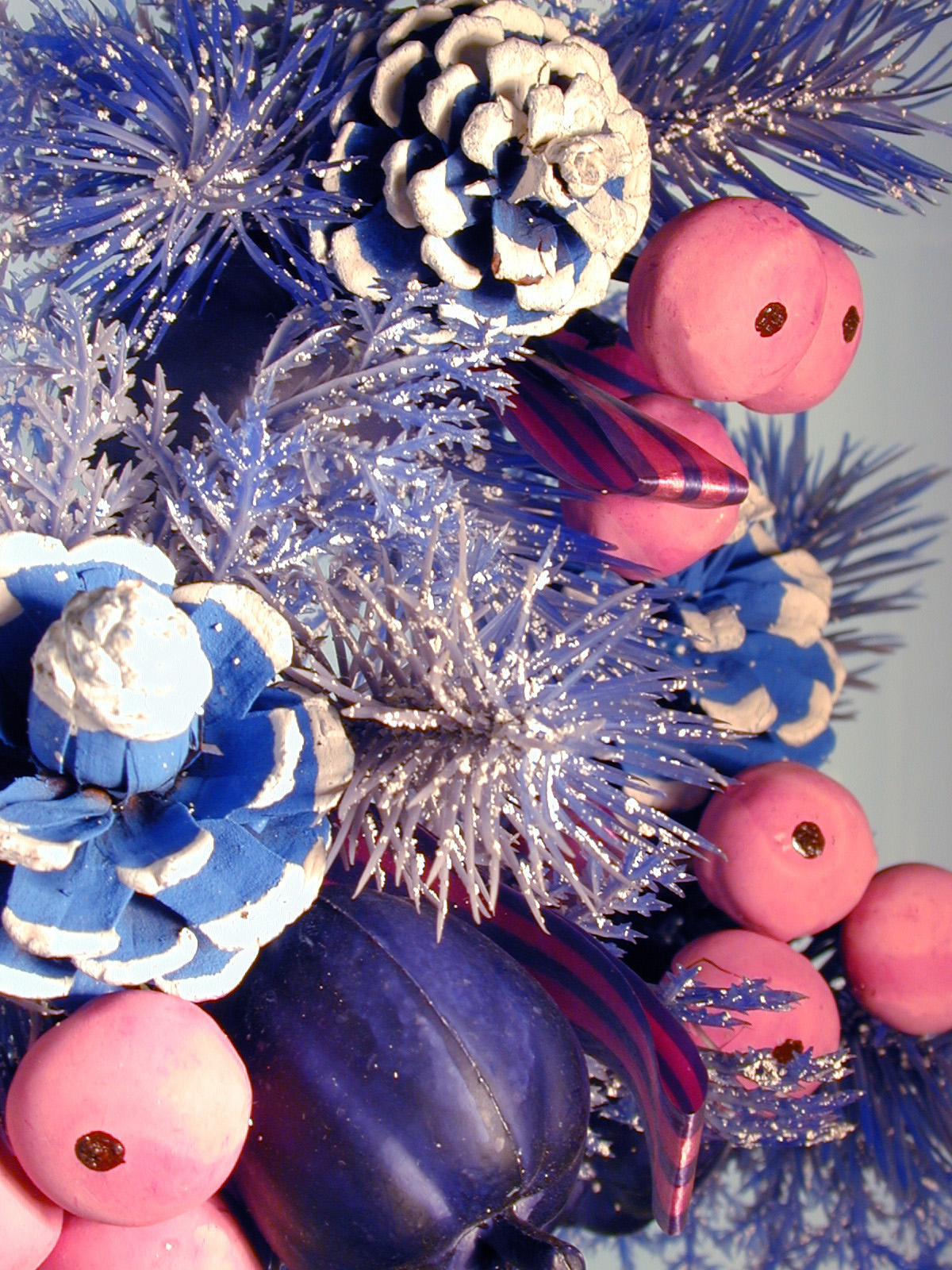 Image Description: Detail of Glitzy Christmas Decoration - Close Up of Purple Plastic Evergreen Tree Branches Accented with Painted Pine Cones, Baubles and Sparkling Glitter