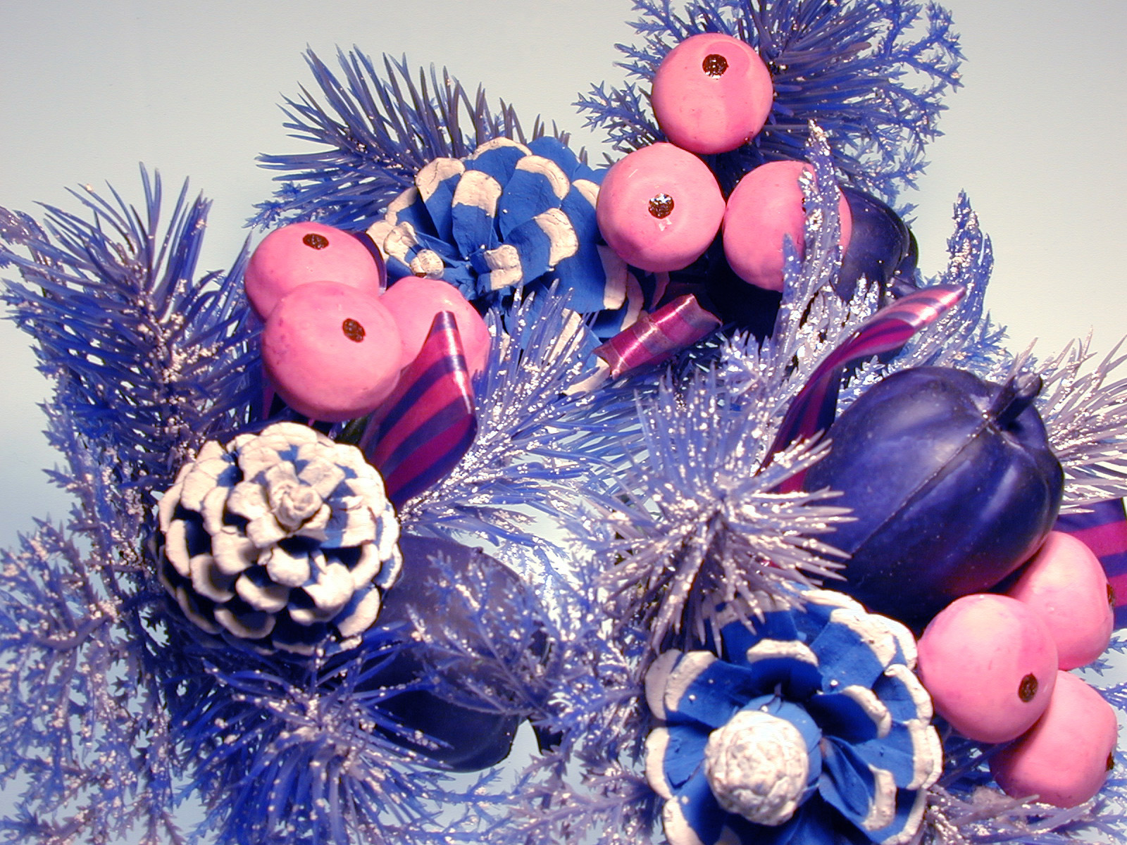 Image Description: Colorized Close Up of Glittering Festive Christmas Decoration Made from Imitation Metallic Evergreen Sprigs and Pine Cones