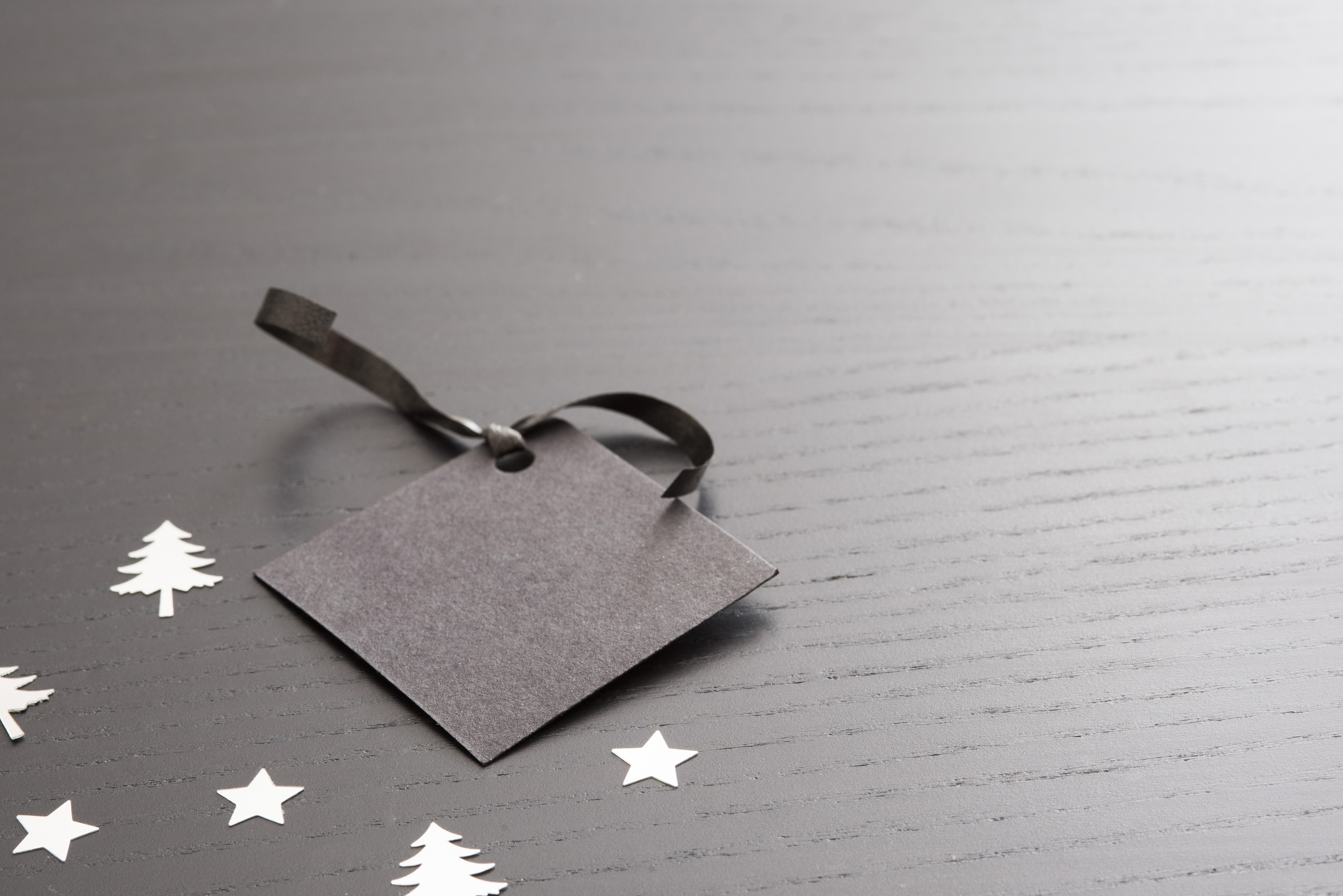 Image Description: a blank christmas gift tag on dark background with silver trees and stars