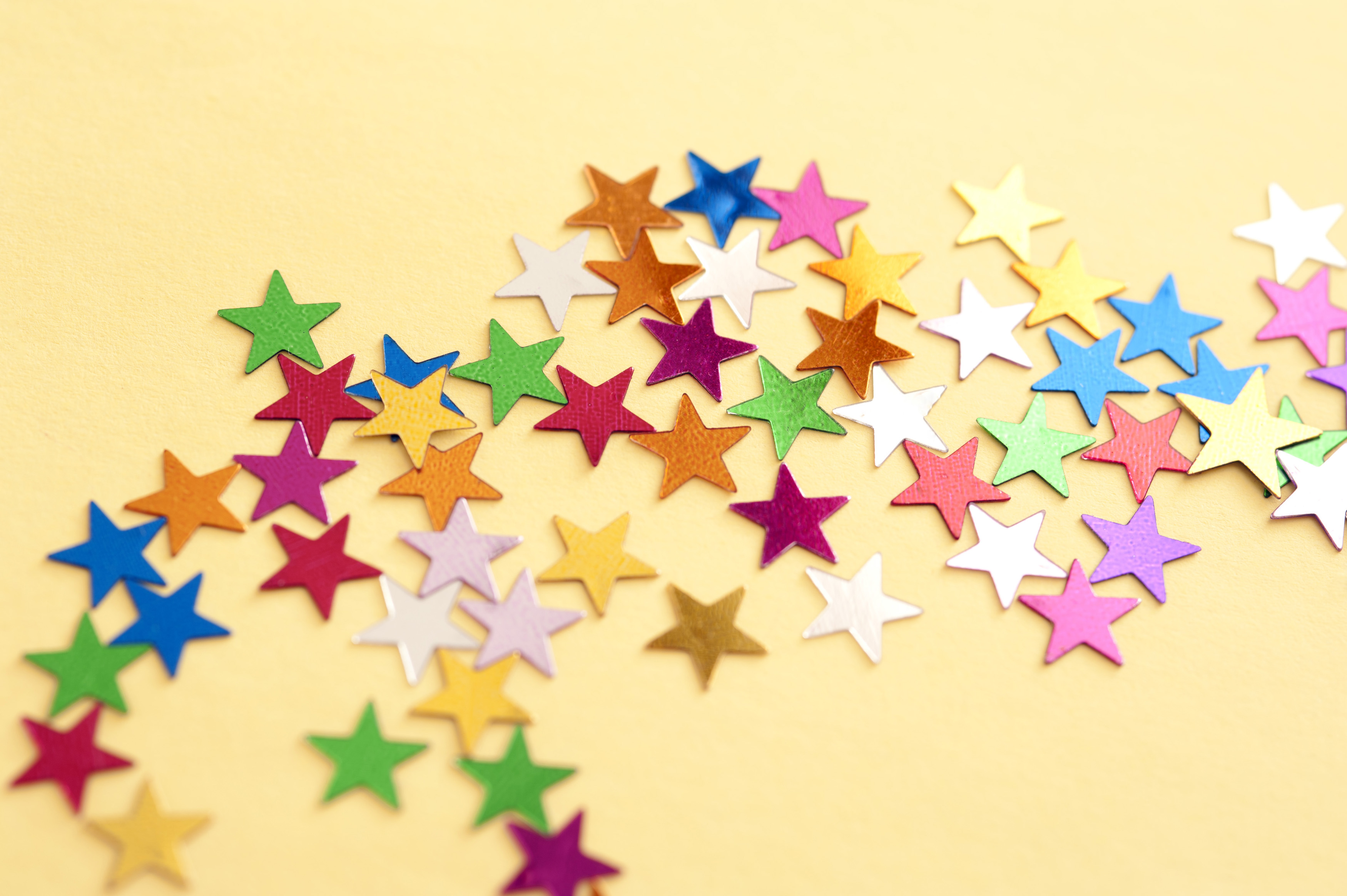 Image Description: Scattering of festive multicolored stars on a yellow background for your Christmas or seasonal greeting