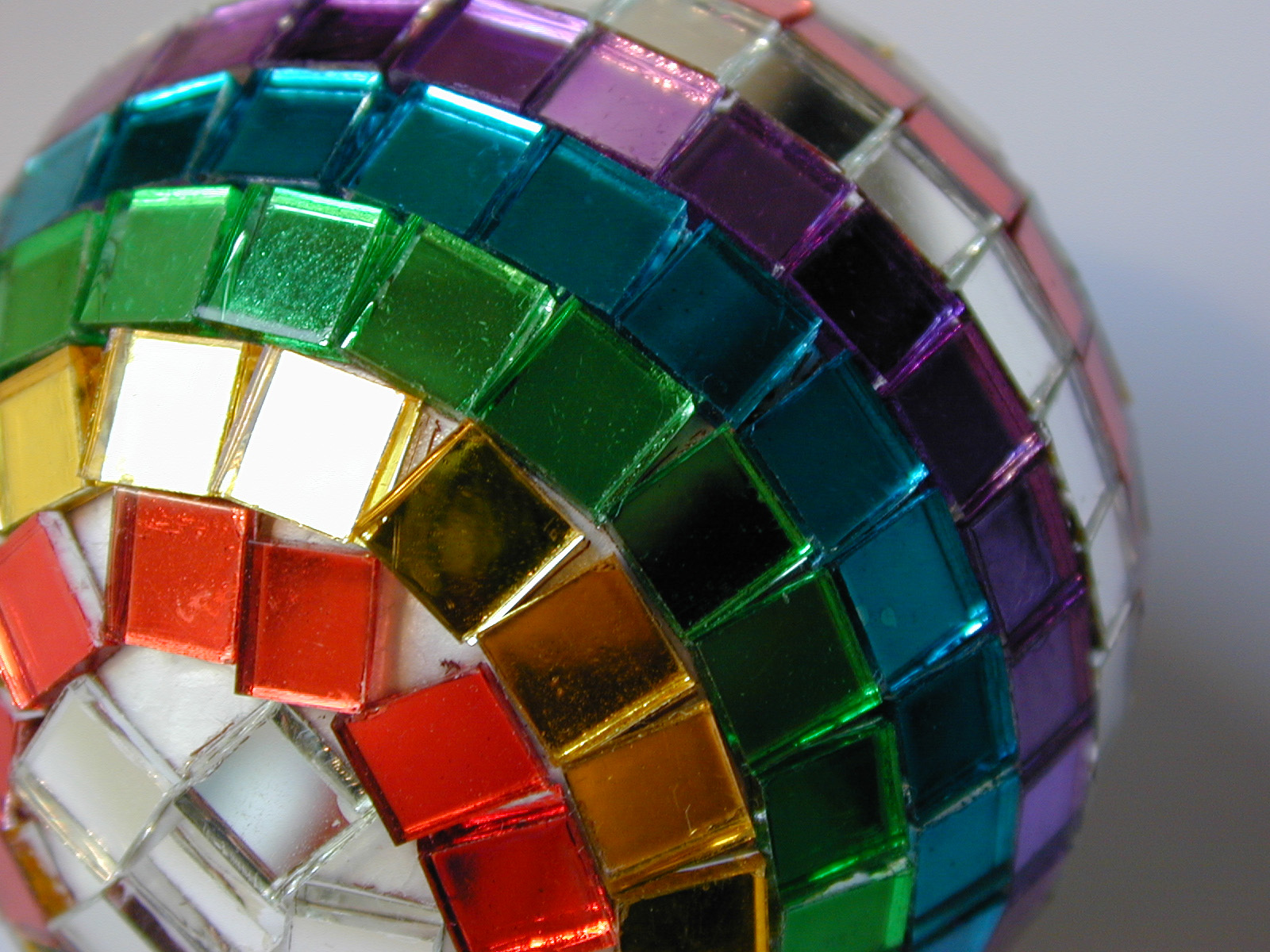 Image Description: Detail of Festive Disco Ball Bauble Decorated with Colorful Mirrored Tiles in Rainbow Pattern