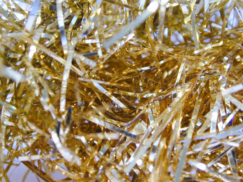 Image Description: Glittering gold tinsel background texture in a close up view for your Christmas or festive celebration