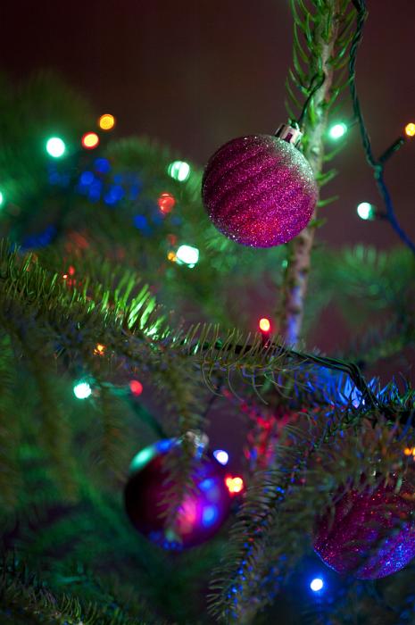 Image Description: Glitter baubles on a natural evergreen Christmas tree in shades of magenta and purple with sparkling festive colorful lights shining in the darkness