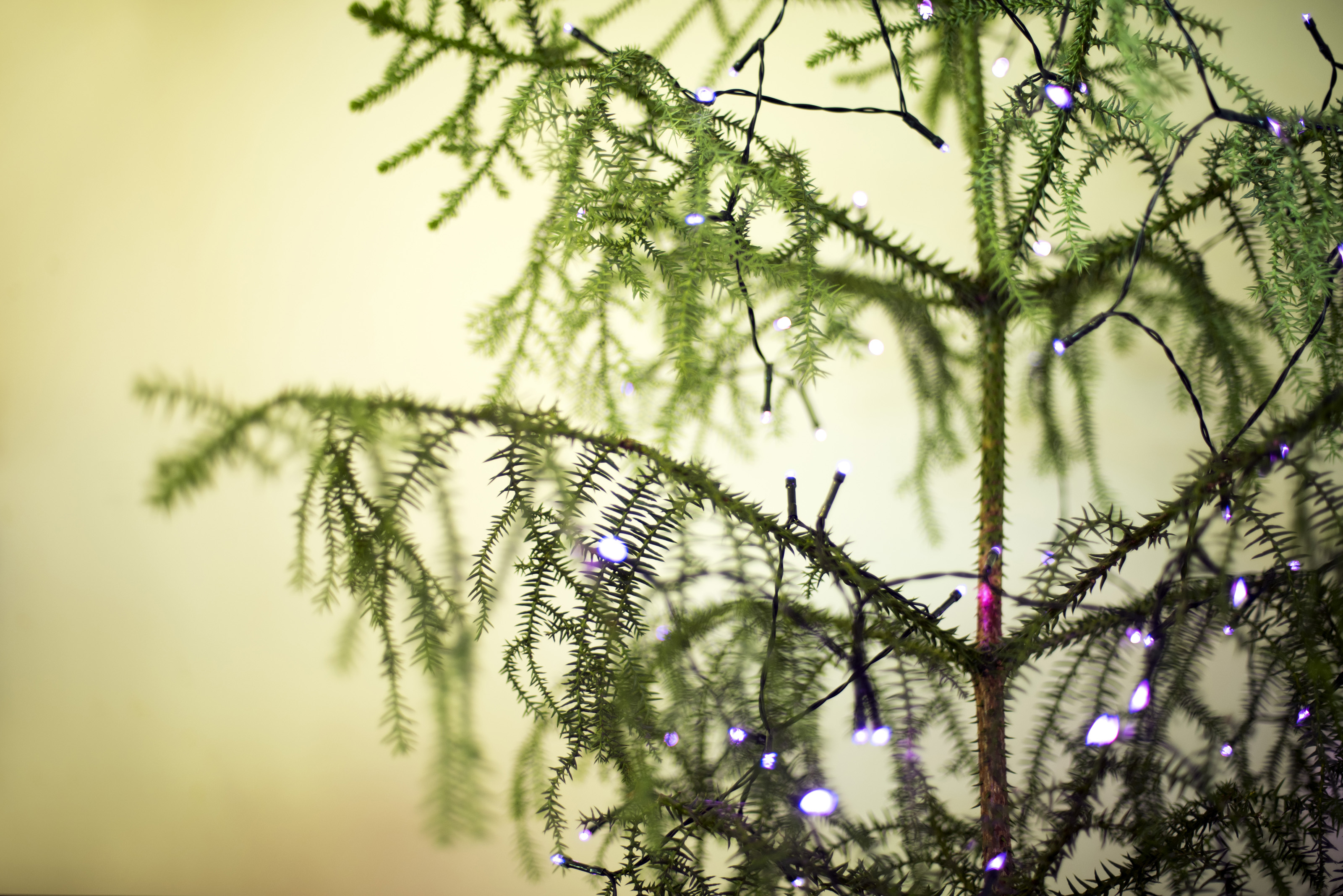 Image Description: details of a christmas tree with pink lights, photographed with a green tint