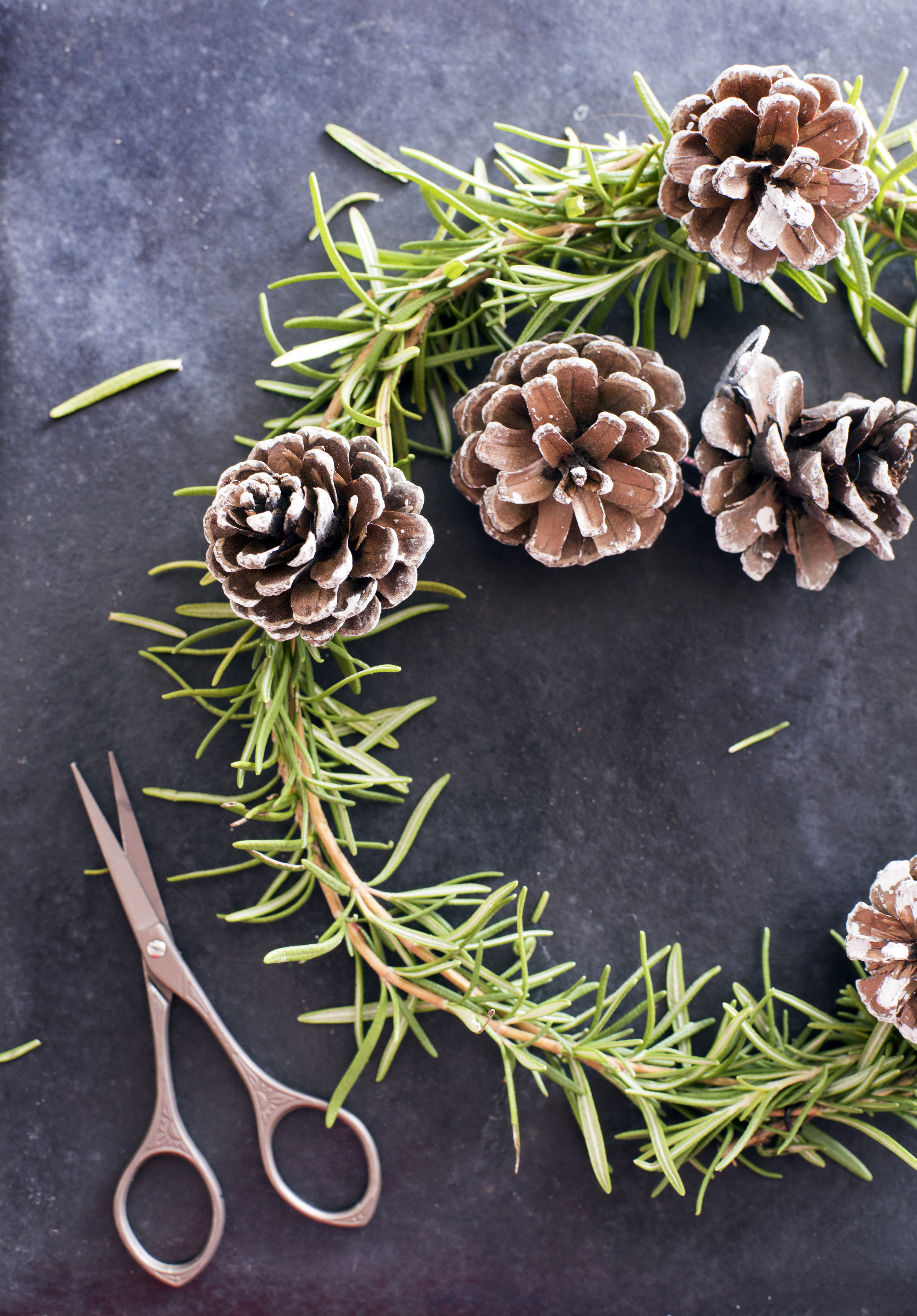 Image Description: Making homemade Christmas decorations with scissors alongside a half completed pine wreath with cones viewed from above