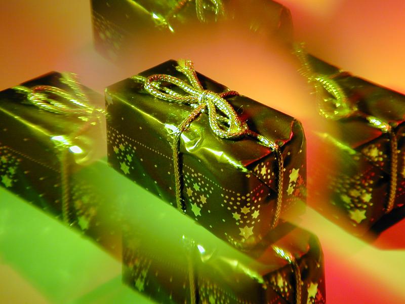 Image Description: A small wrapped christmas gift lit by coloured lights with a mesmerising lens effect