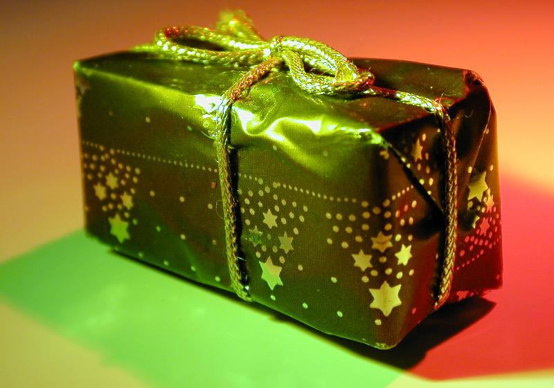 Image Description: Small Gift Wrapped in Star Patterned Paper and Gold Rope Lit Dramatically with Green and Red Light