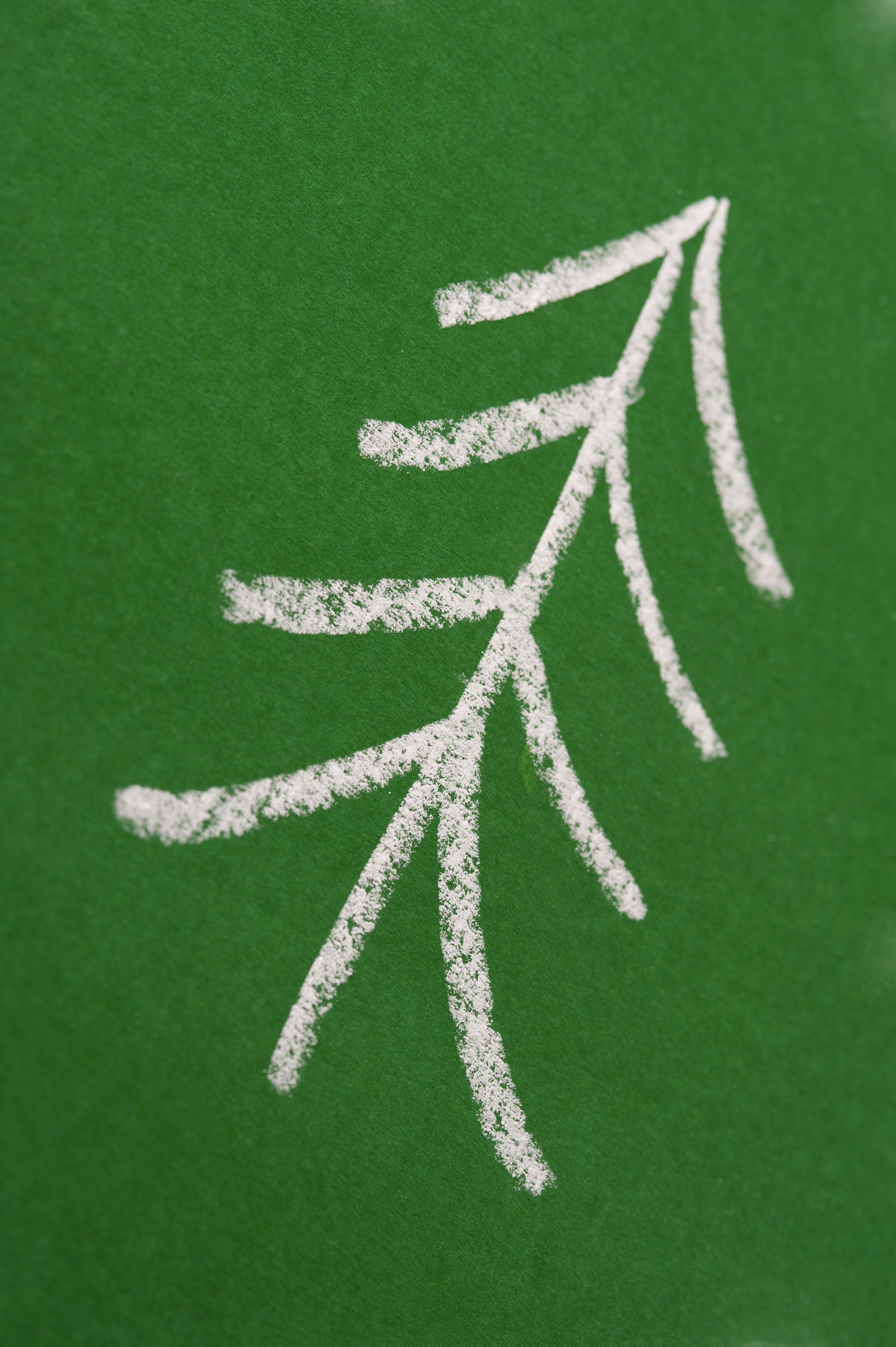 Image Description: Simplistic childlike hand-drawn chalk pine tree on a green chalkboard, diagonal orientation
