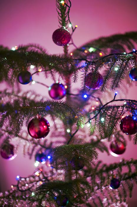 Image Description: Fresh decorated evergreen Christmas tree hung with baubles and sparkling lights over a festive pink background