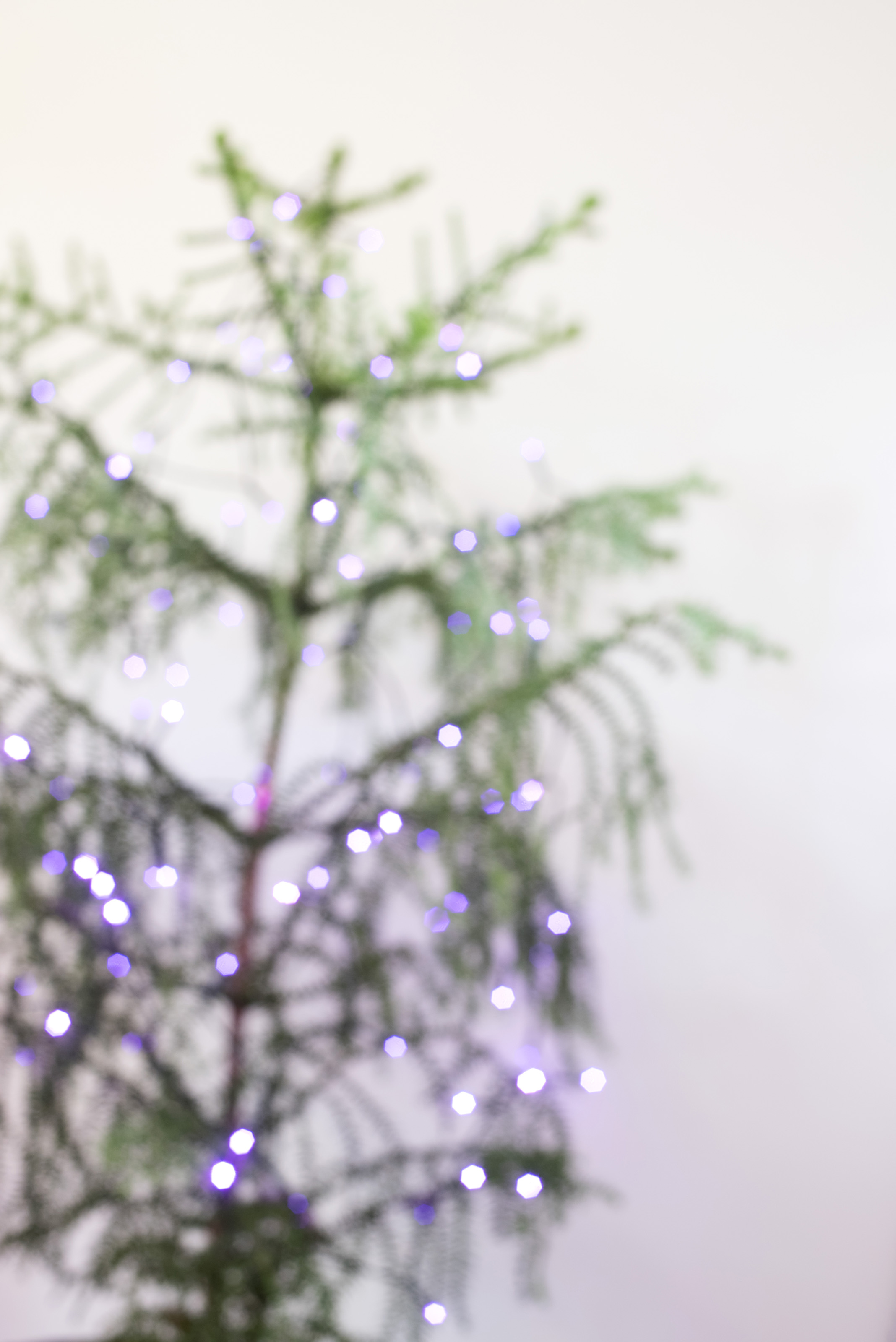 Image Description: defocused background of a christmas tree with purple twinkling lights