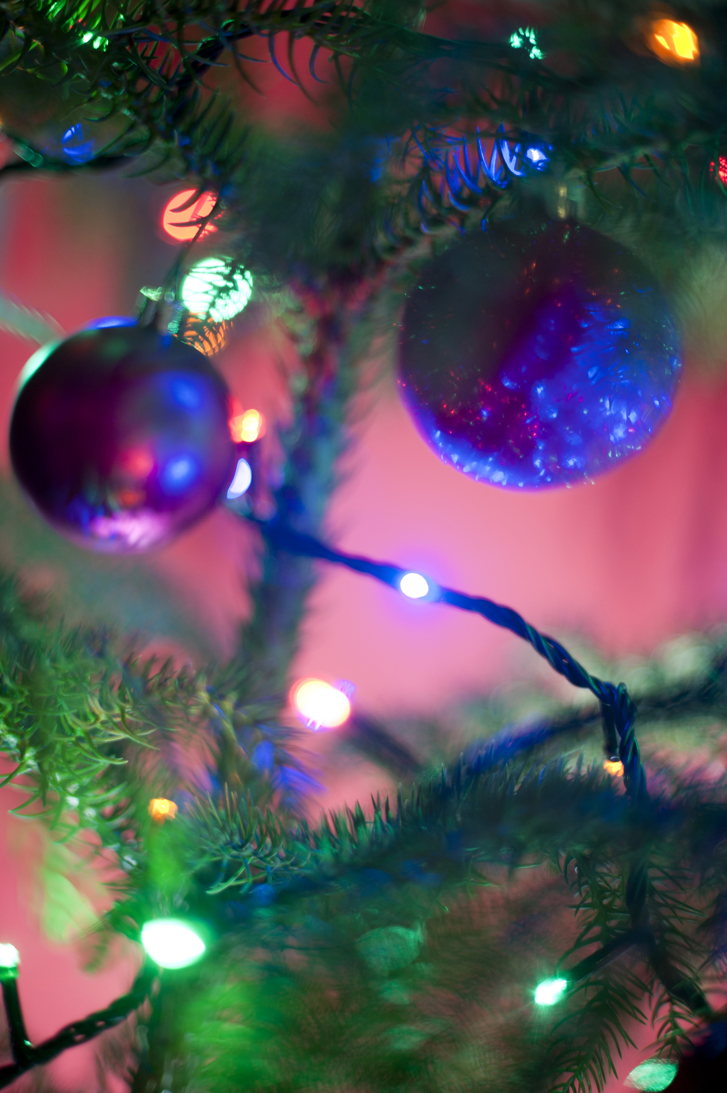 Image Description: Close Up Detail of Small Evergreen Christmas Tree Decorated with Strings of Colorful Lights and Sparkling Christmas Balls