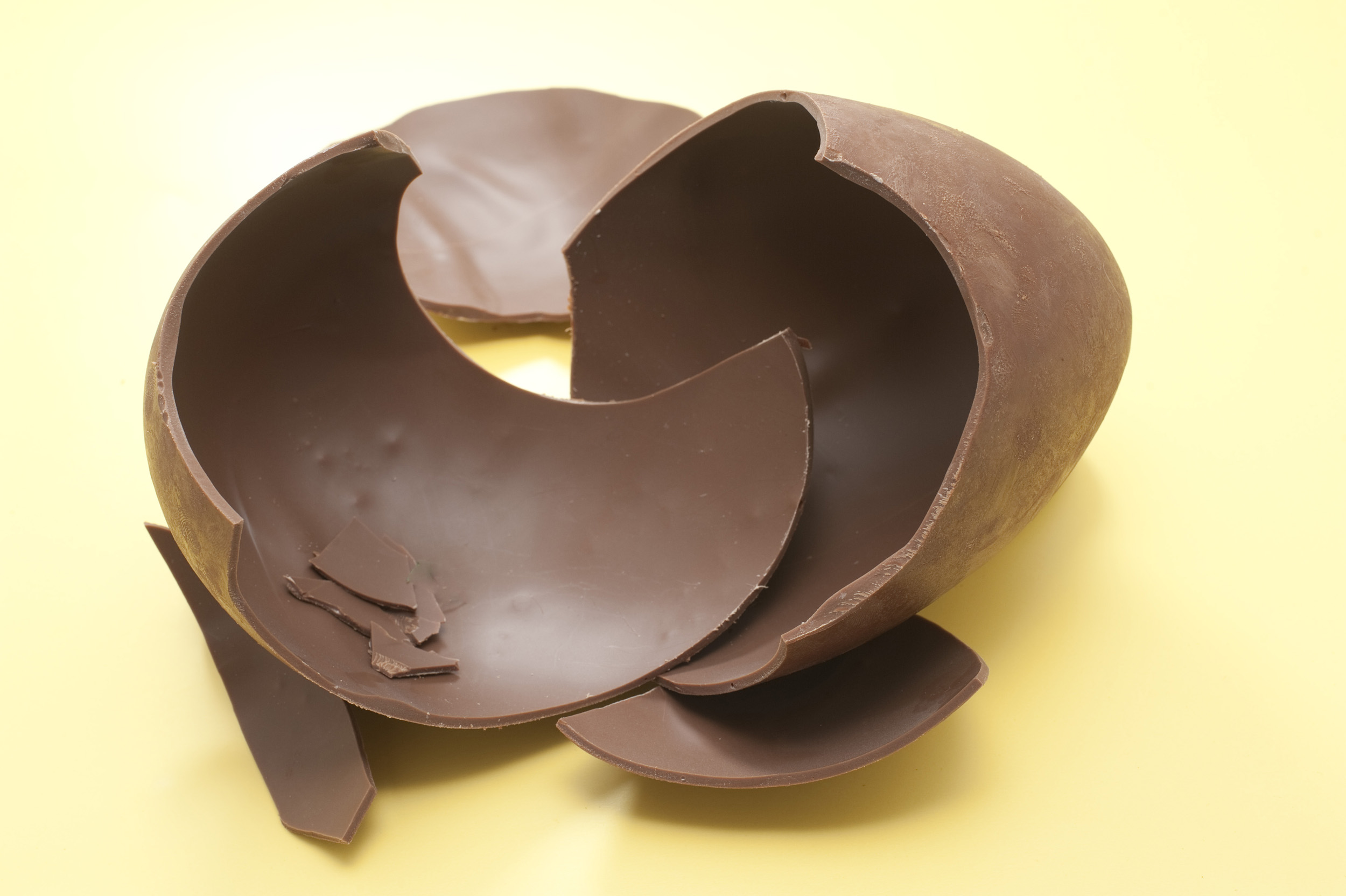 Image Description: Pieces of a chocolate Easter Egg photographed over yellow.