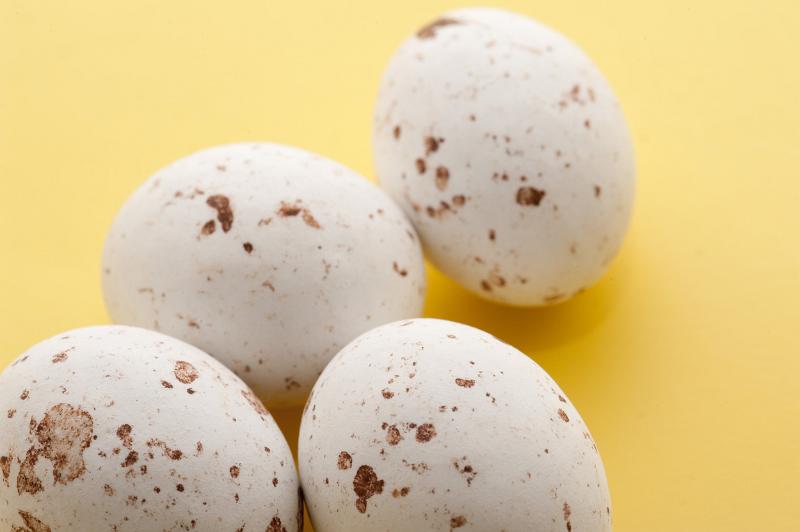 Image Description: Speckled Easter Eggs. Four speckled candy Easter eggs, close-up view on yellow.