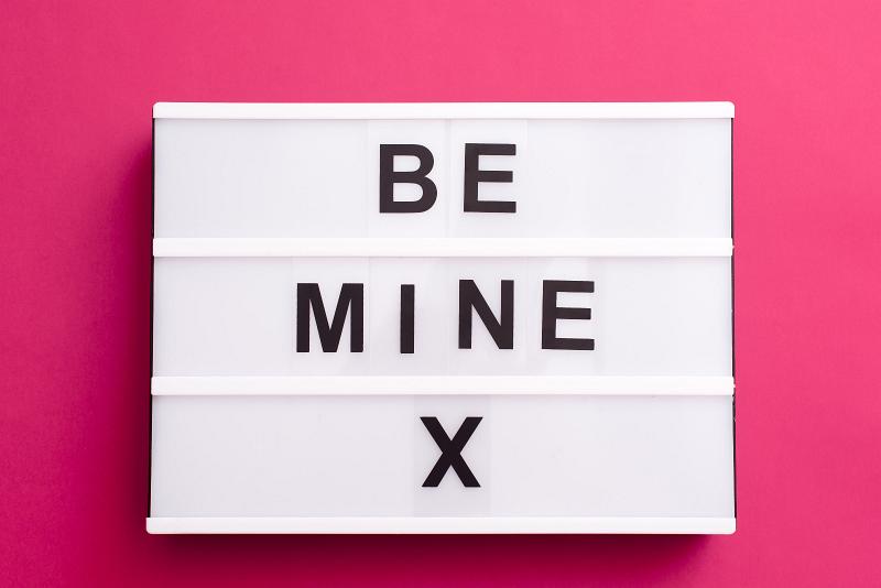 Image Description: Sentimental Be Mine X Valentines message with bold text on a small light box over a bright pink background