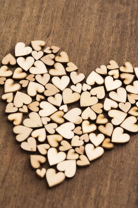 Image Description: Heart shape composed of many small little wooden hearts conceptual of Valentines Day, love, romance, anniversary or wedding on a wood background
