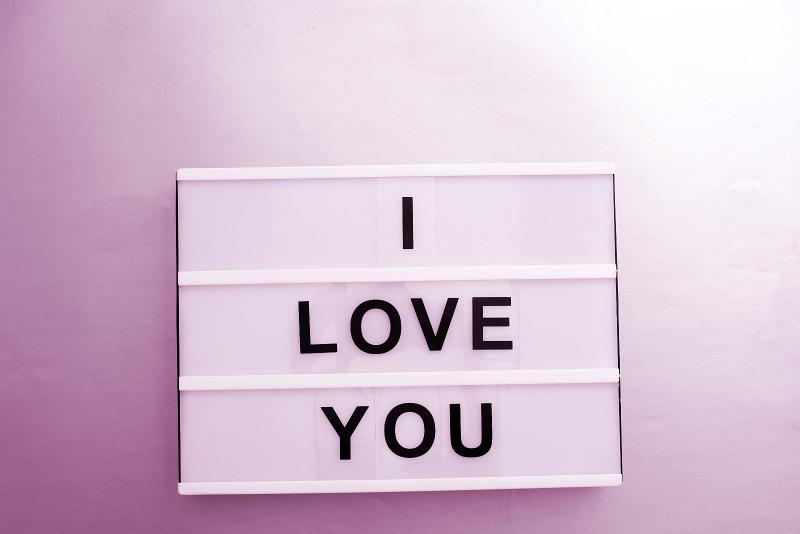 Image Description: White lightbox with I Love You message sign of black changeable letters, against wall in purple lighting. Love concept