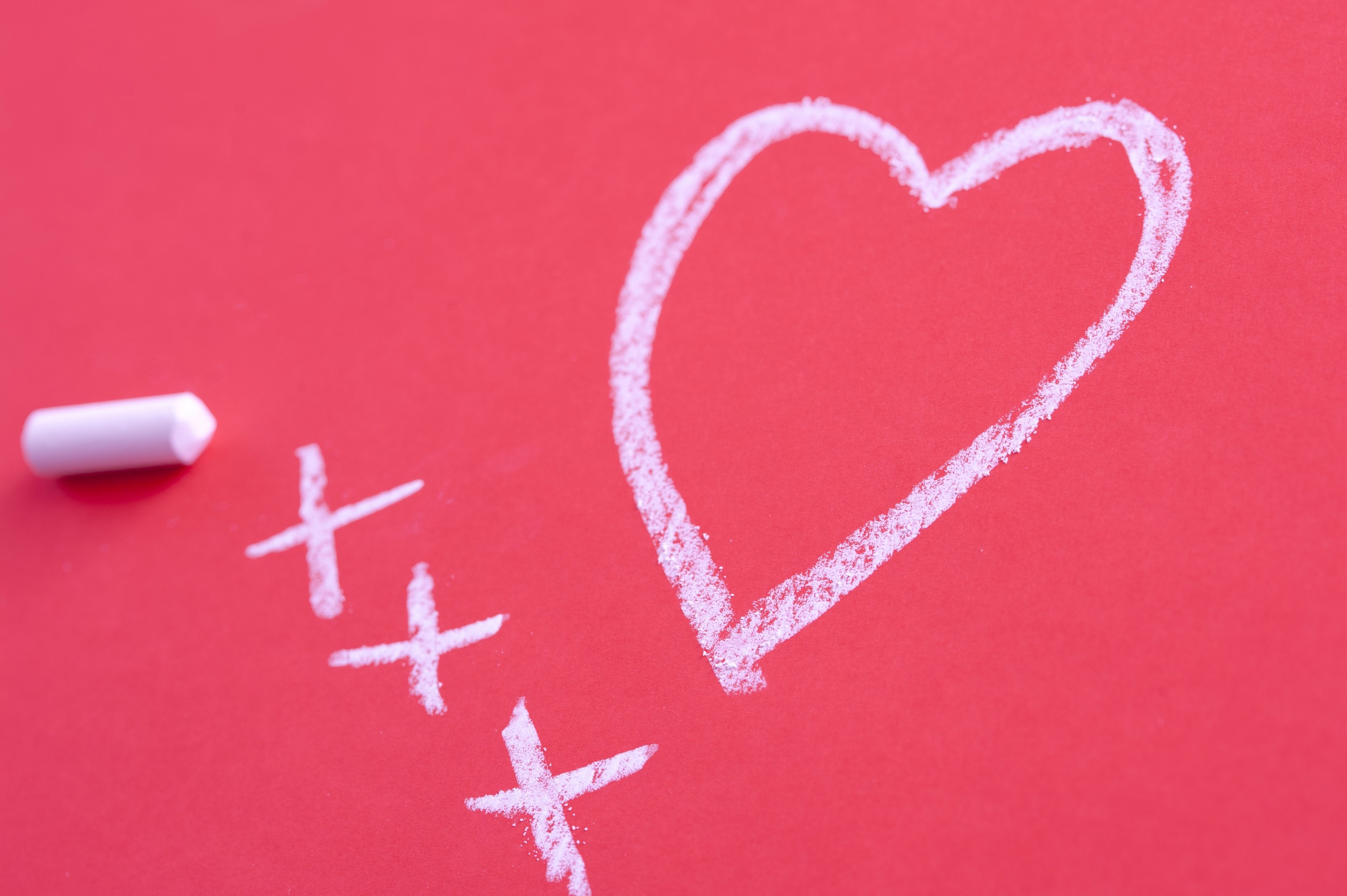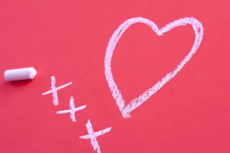 Image Description: a love heart symbol and three chalk kisses hand drawn on a pink tinted surface