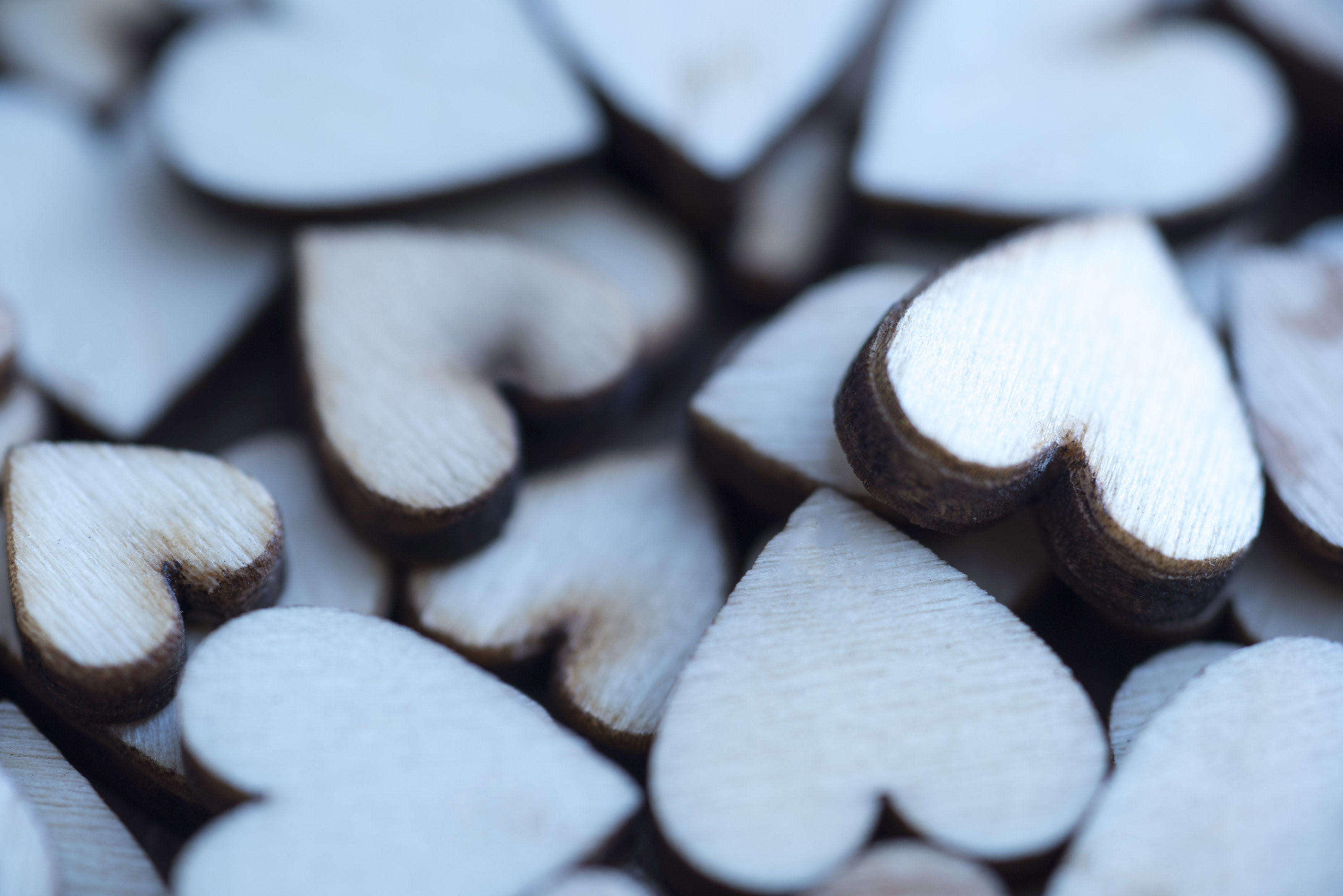 Image Description: Valentines background of jumbled wooden hearts with a shallow dof symbolic of love, dating and romance