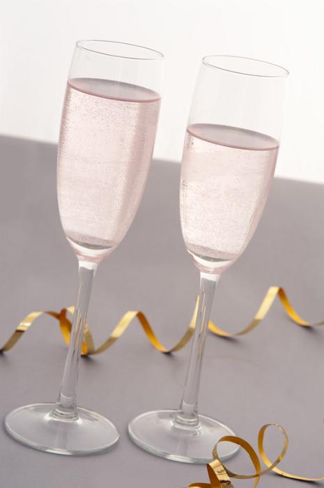 Image Description: Two elegant flutes of sparkling pink party champagne to celebrate a festive or romantic occasion with a coiled gold decorative streamer