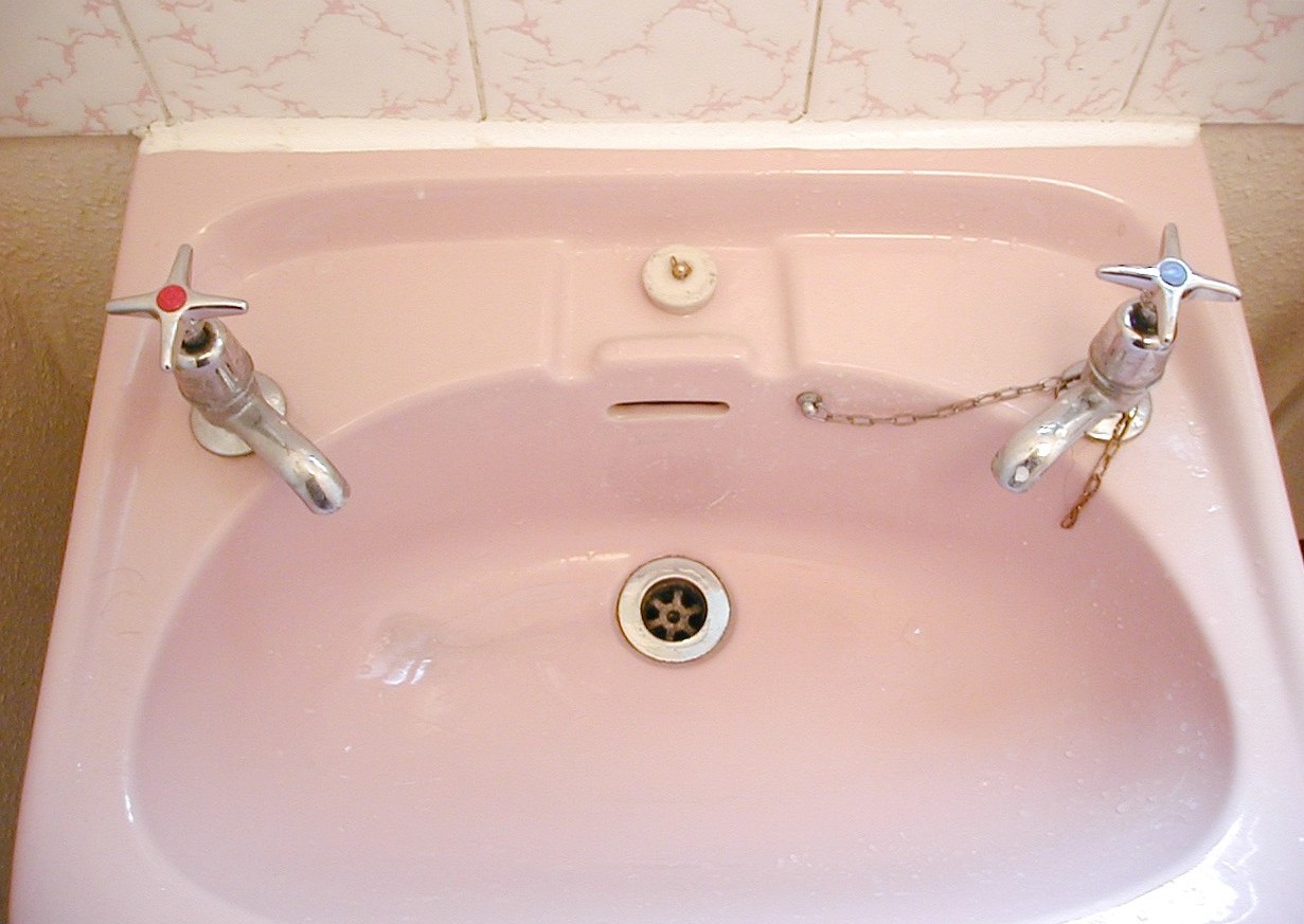 Image Description: a pink coloured bathroom sink