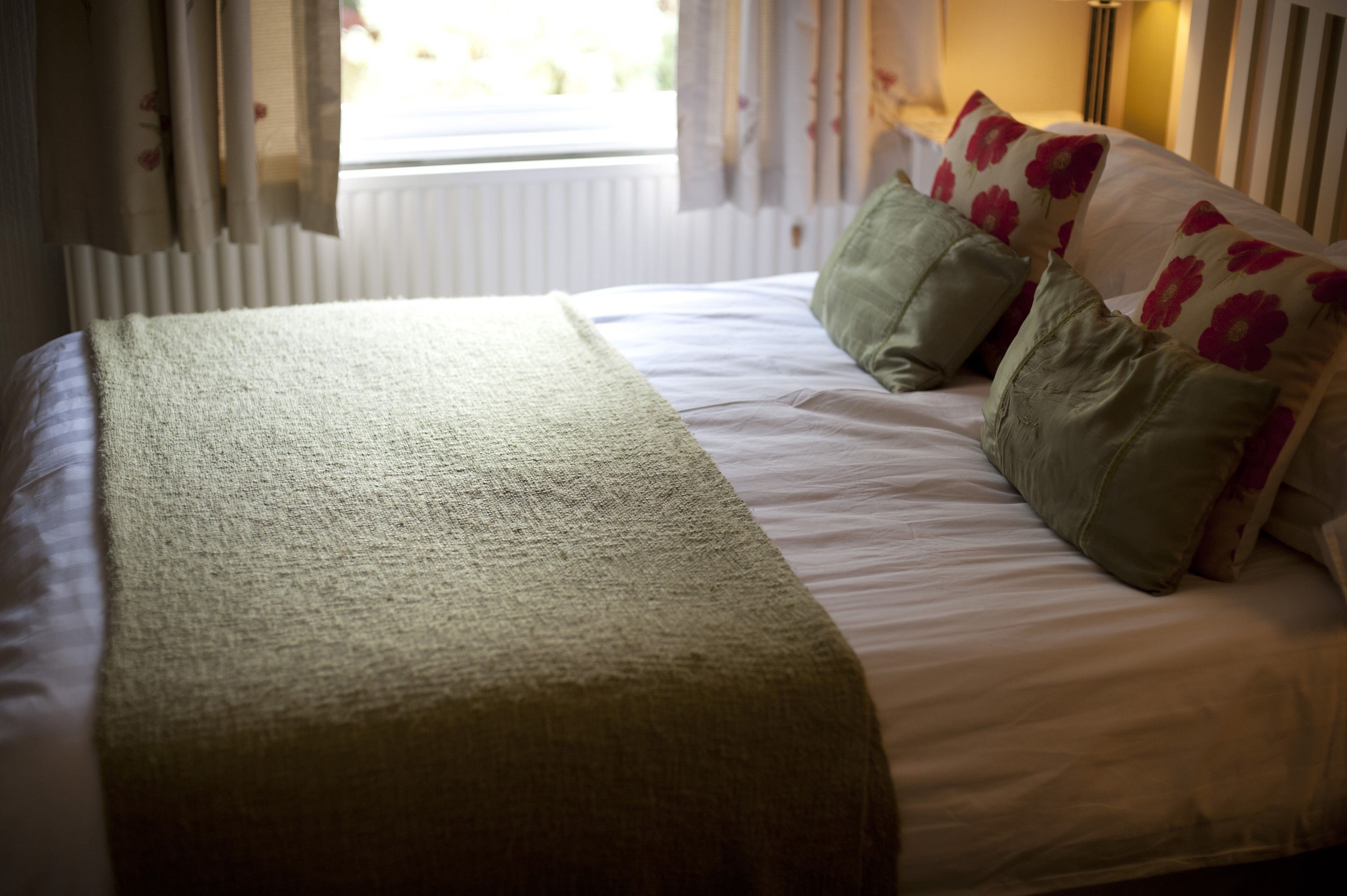 Image Description: Comfortable relaxing double bed with neutral decor in daylight from a window