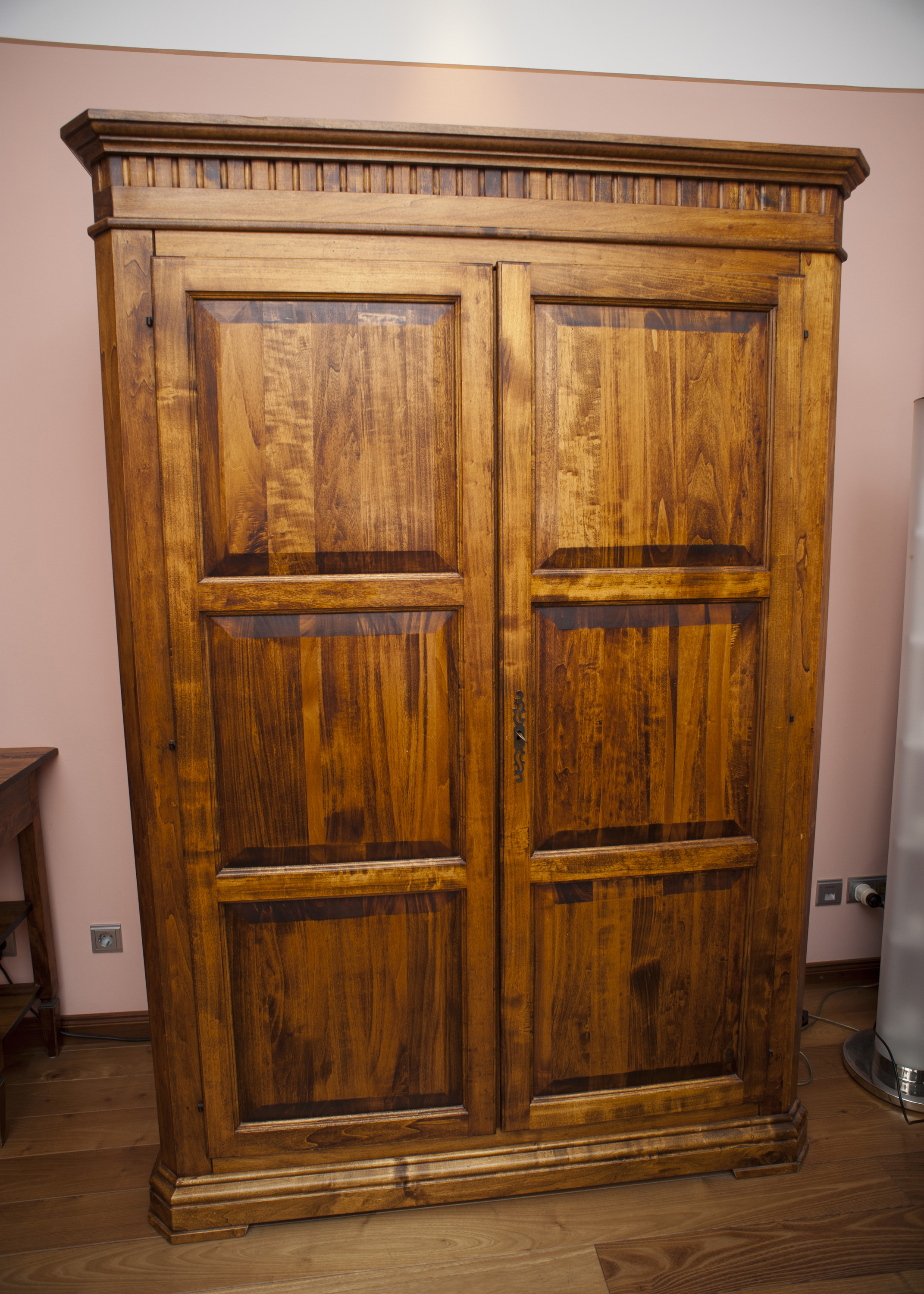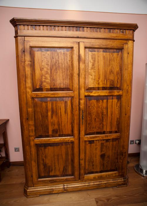 Image Description: Old vintage wooden wardrobe or armoire with closed doors standing in a bedroom, close up view