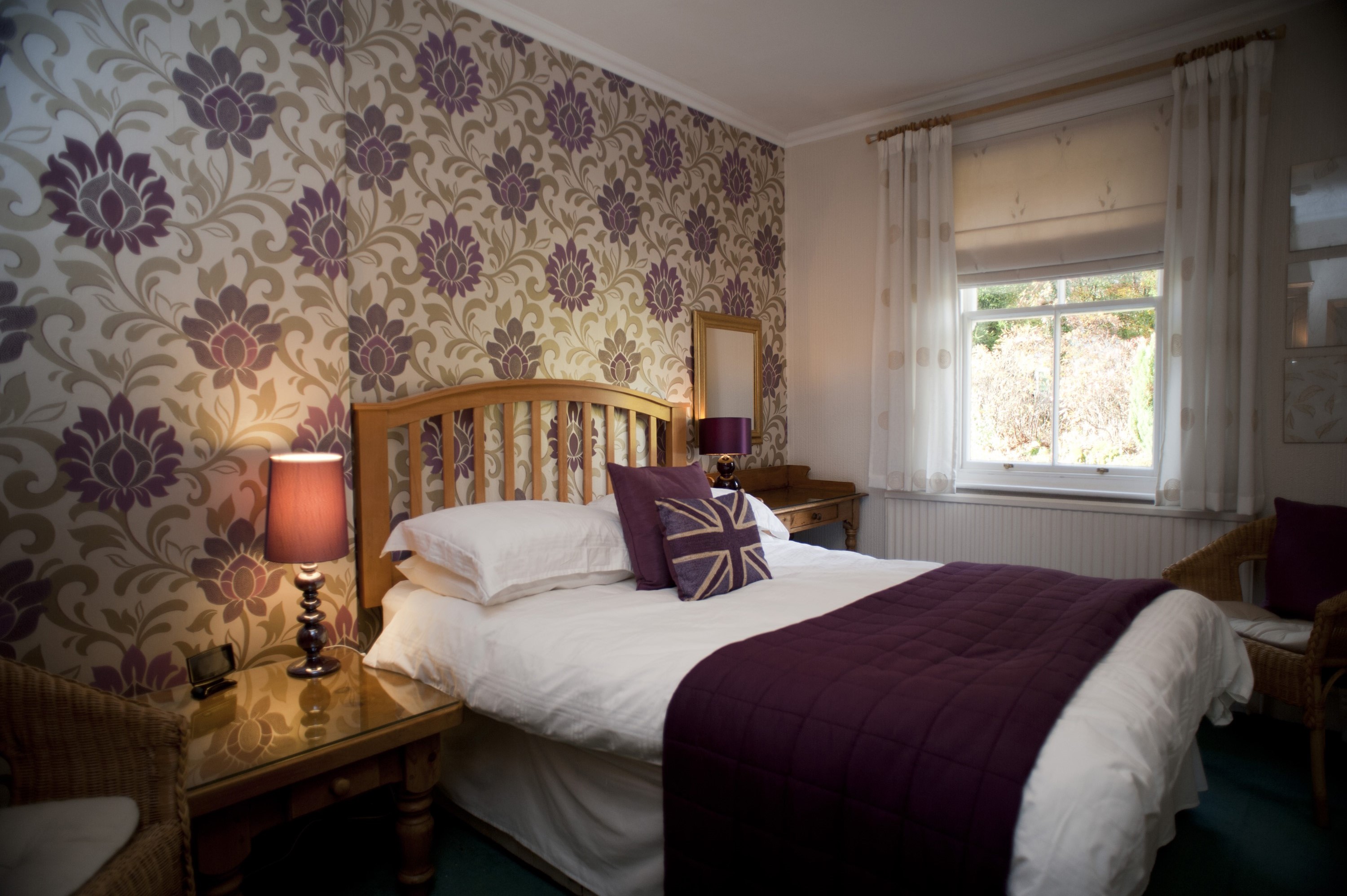 Image Description: Cozy bedroom with a comfortable wooden slatted bed with a lamp burning on the bedside table and bold wallpaper with a big motif