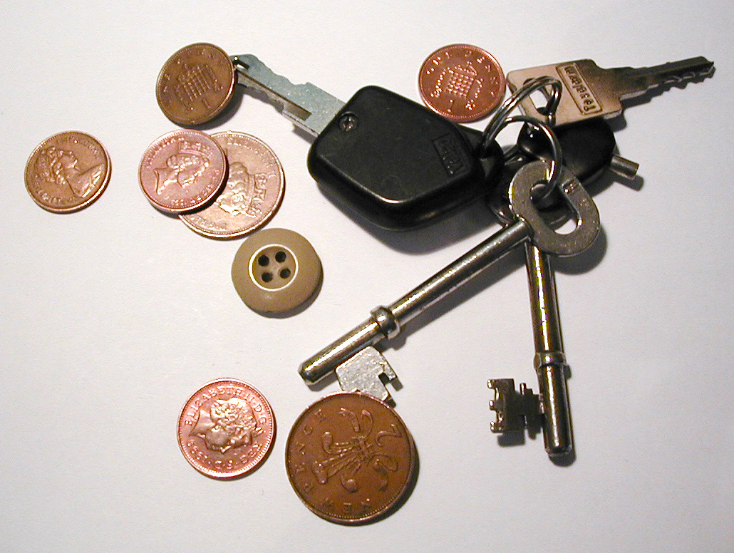 Image Description: A bunch of house and car keys with scattered coins and a single brown button lying in random array on a grey surface