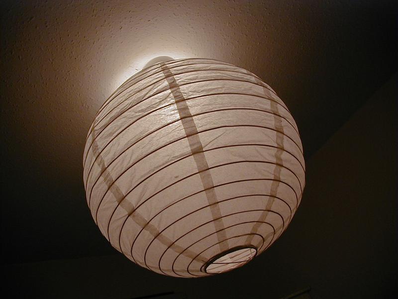 Image Description: Lit paper and rattan globe lampshade glowing on a dark ceiling in a power, energy and interior decor concept