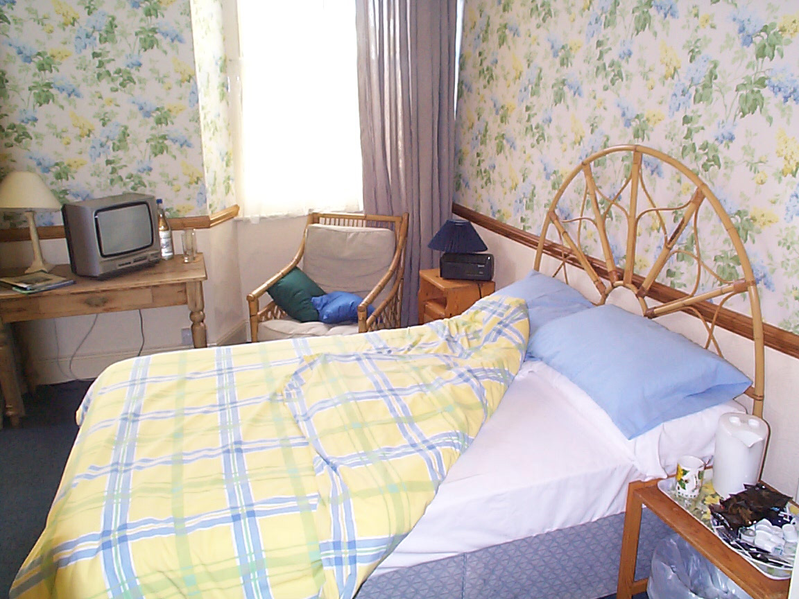 Image Description: Neatly folded back bed in a blue bedroom with pretty floral wallpaper, a bamboo headboard and a retro television set