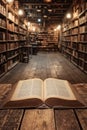 Image Description: Open book with text on both pages placed on a table, close-up with copy space, concept of literature, knowledge and culture