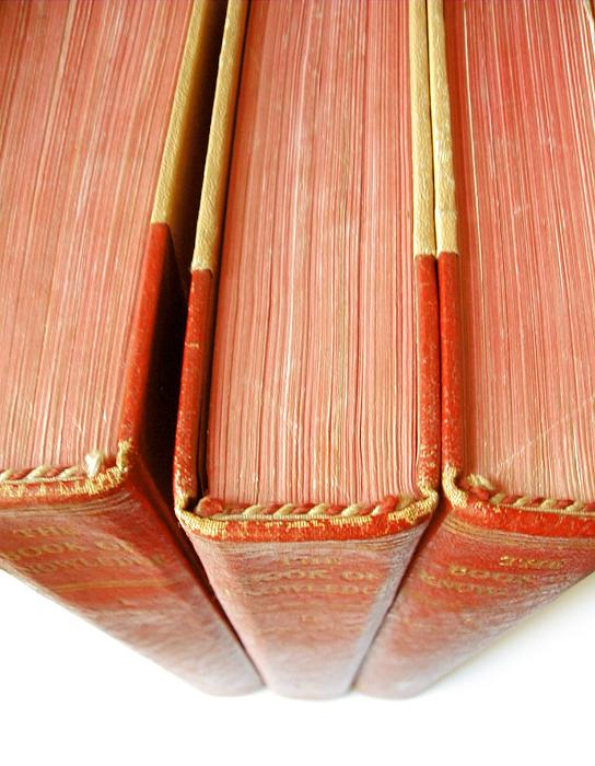 Image Description: Three red leather bound books viewed from the top of the spine and pages looking down to a white background