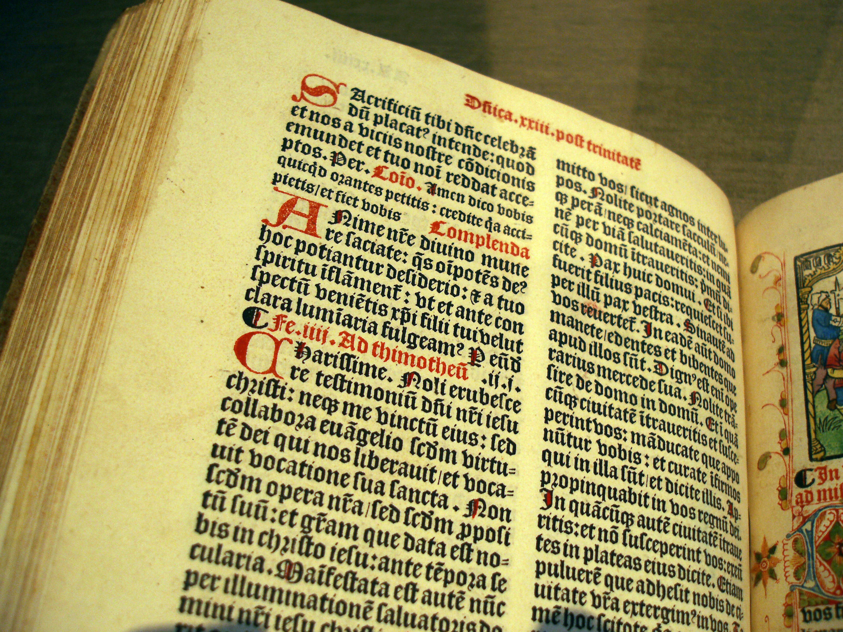 Image Description: Text written with antique fonts and drop caps on the yellow page of an old illustrated open book, close-up