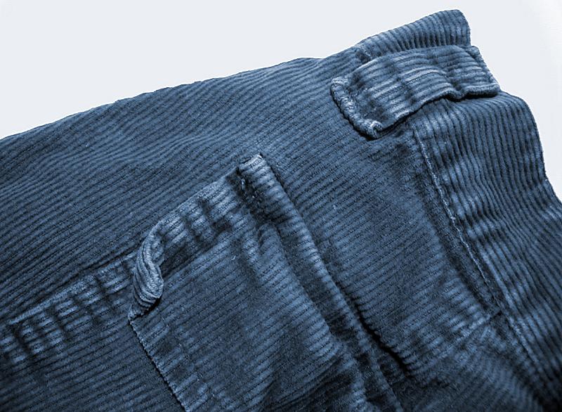 Image Description: Close up detail of the textile and weave of a pair of blue corduroy trousers isolated on white