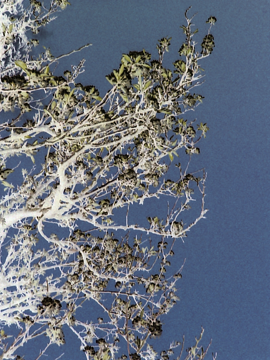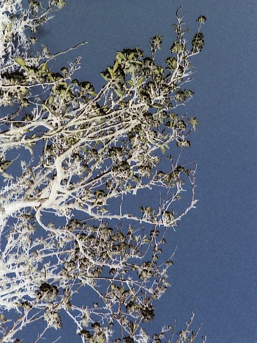 Image Description: Abstract pattern in nature formed by the intricate tracery of intertwined tree branches against a blue sky