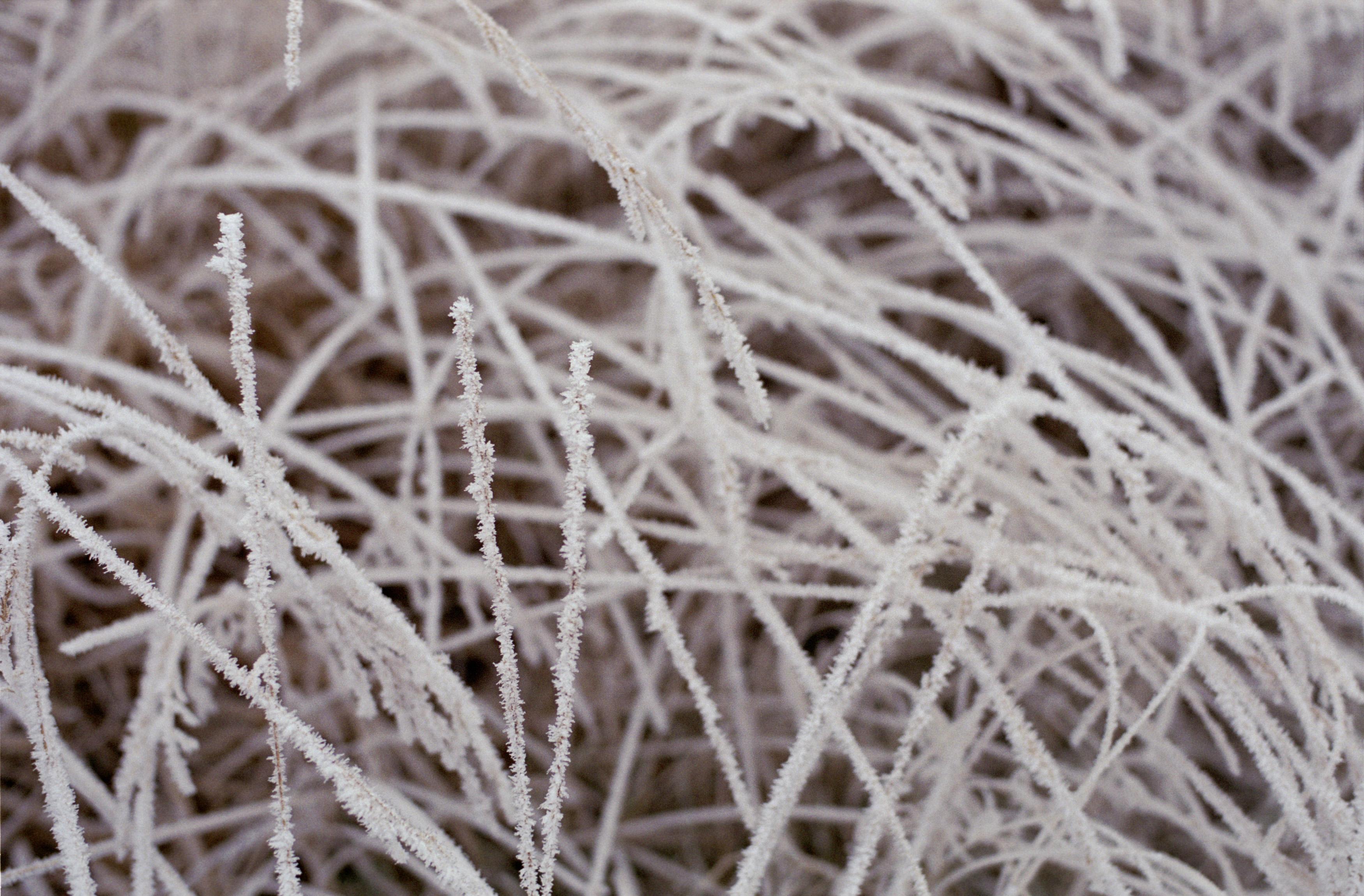 Image Description: Background texture and pattern of strands of dried brown frosted grass on a winter morning, full frame