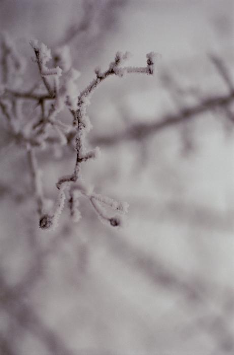 Image Description: Extreme close up of delicate branch covered in white frost, other branches visible in background, focus on foreground
