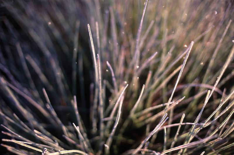 Image Description: Close up background view of blades of frozen winter grass covered in hoar frost in early morning sunlight