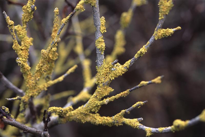 Image Description: Close up detail of colorful yellow lichen growing on a dead branch of a tree or shrub over a dark background