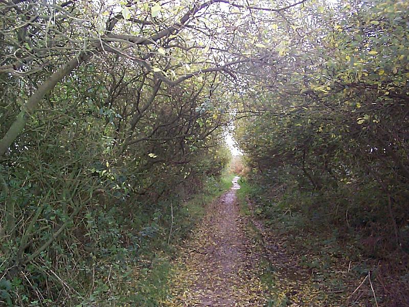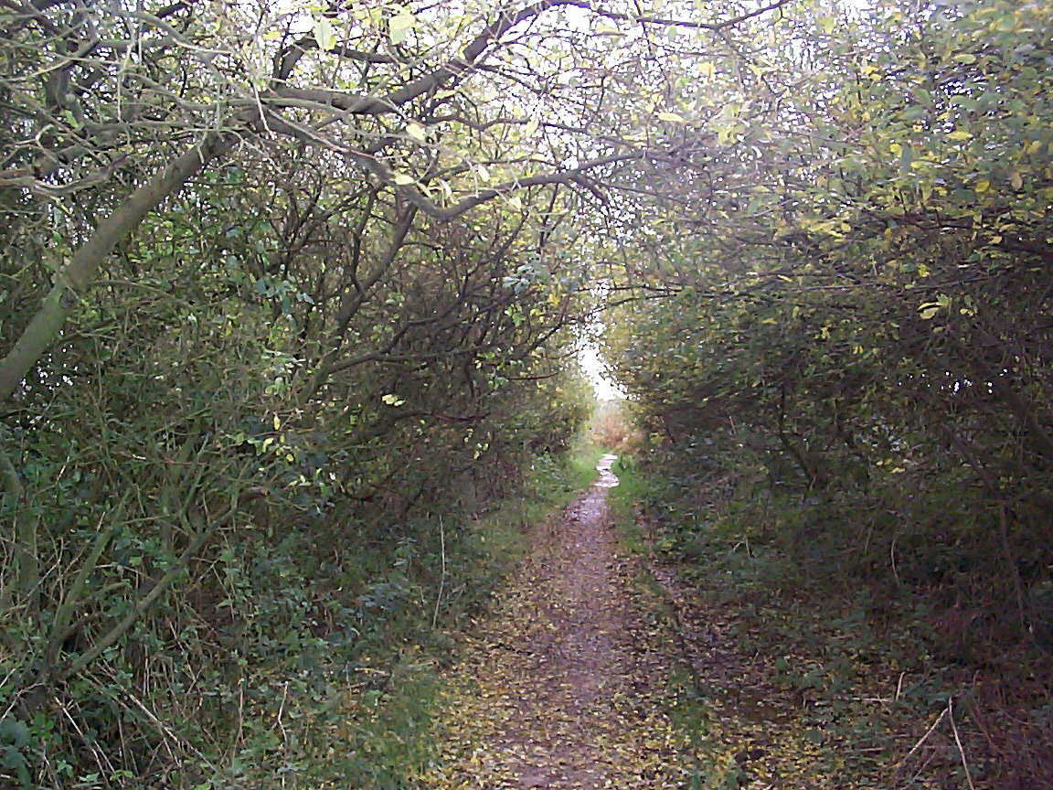 Image Description: Narrow path in overgrown woods, with Autumn leaves on the forest floor, daylight shining through tree branches